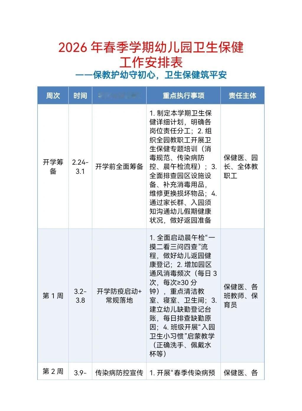 2026幼儿园卫生保健工作安排表~太详细了 2026年春季学期幼儿园卫生保健工作安排表(共18周) 幼儿园卫生保健工作 幼儿园卫生保健工作行事历 幼儿园卫生保健工作月安排 幼儿园卫生保健工作计划 工作安排表