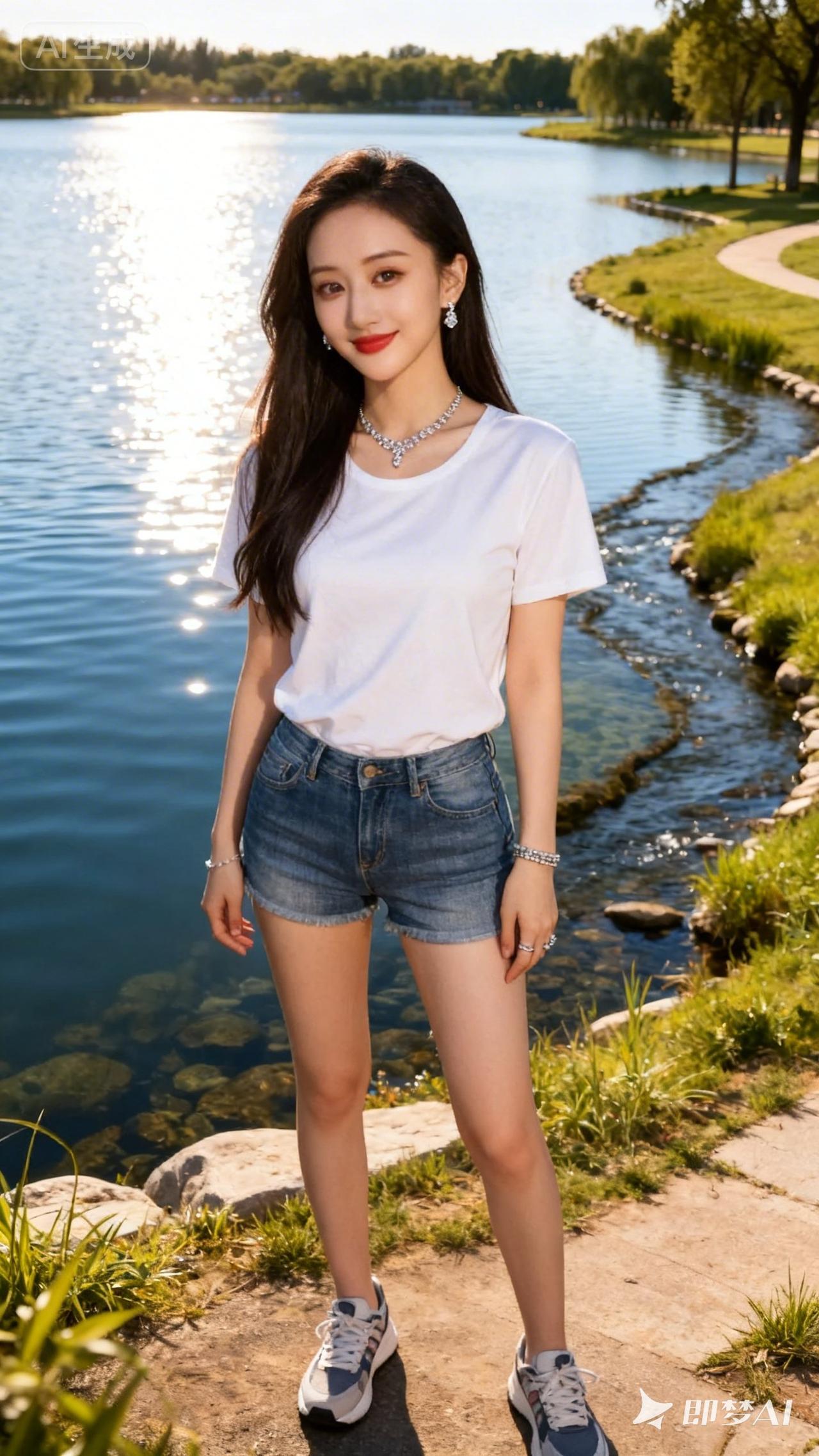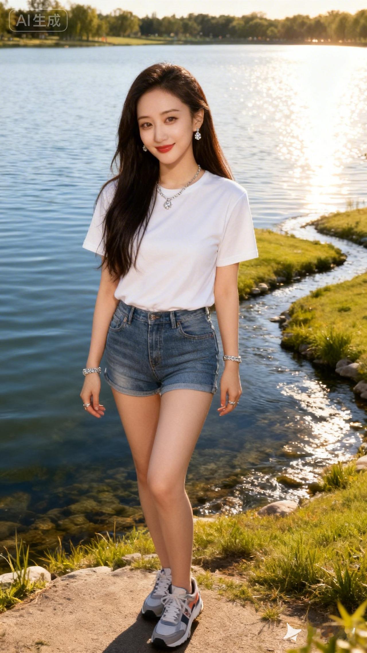 夏日湖畔清新穿搭,白色T恤+牛仔短裤,轻松自在,享受美好时光!🌞💙👗