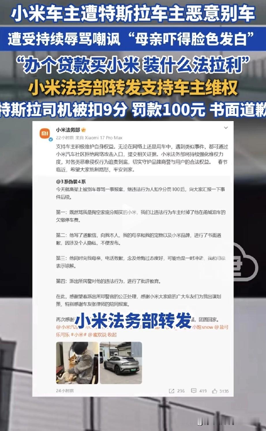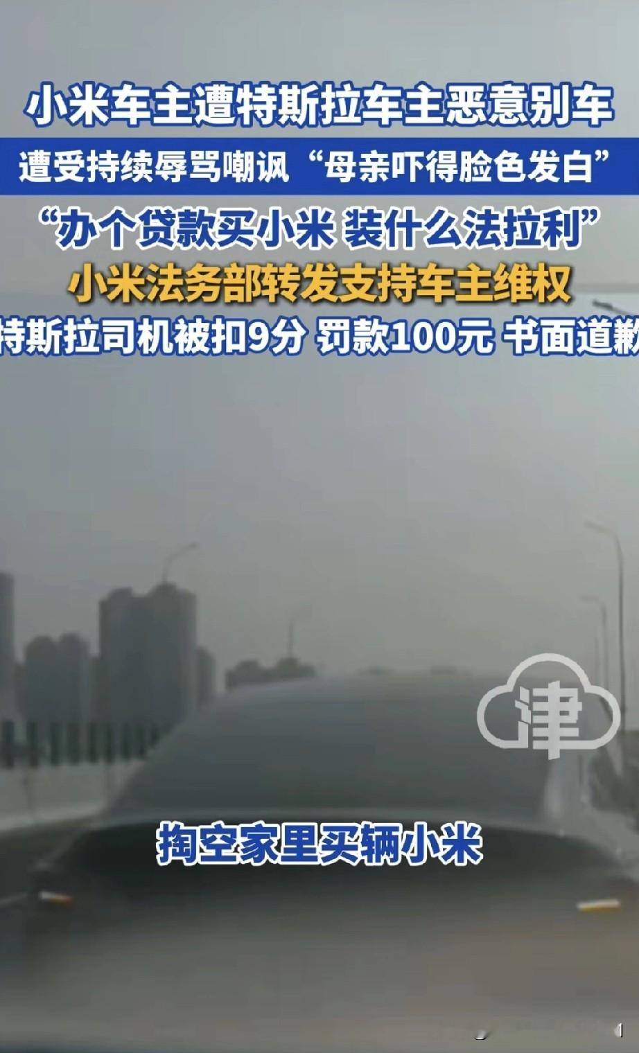 不管开的是小米、特斯拉还是其他车,危险驾驶、恶意别车、逼停、辱骂等行为,既违法又缺德,已然触犯交规、危害公共安全,该处罚就得处罚,没什么可狡辩的。