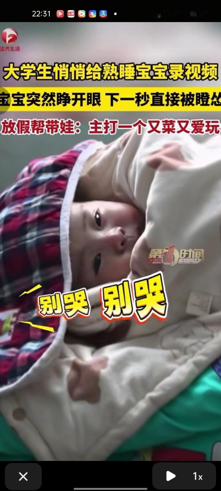 2月16日,安徽合肥。大学生悄悄给熟睡宝宝录视频,宝宝突然睁开眼,下一眼直接被瞪