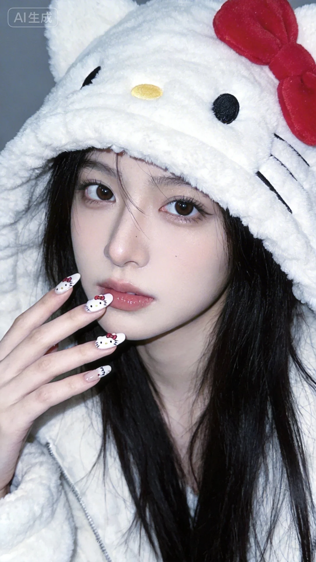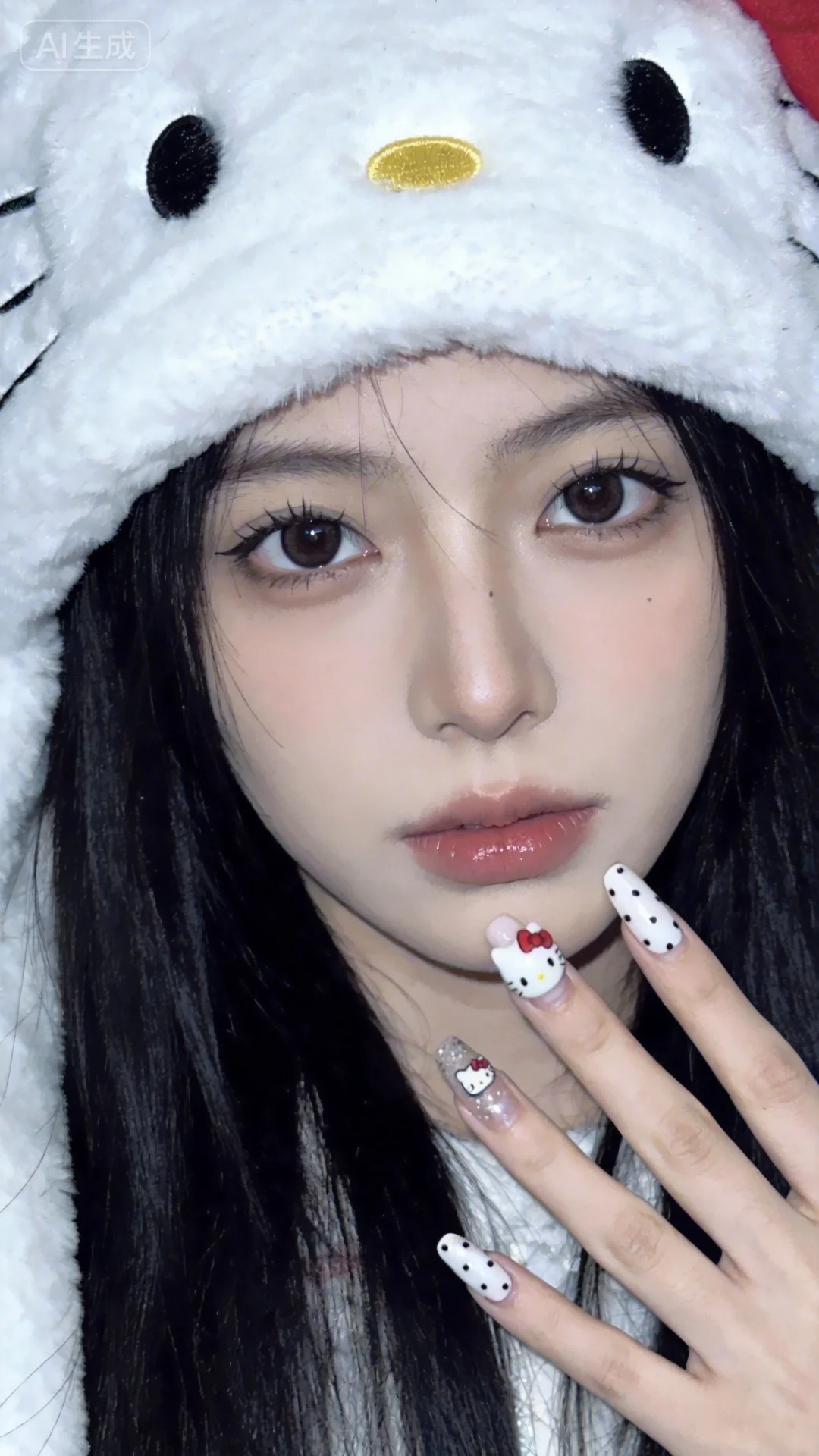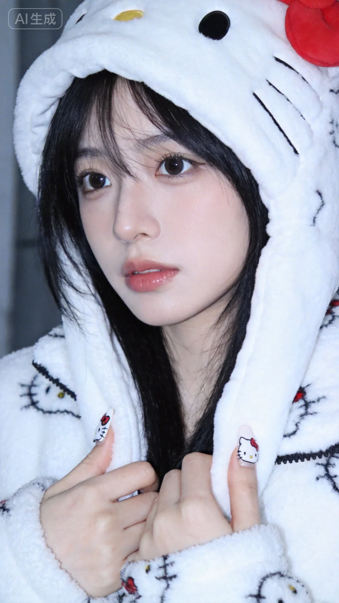 惊艳,亚洲少女。大眼睛。唯美,甜美,梦幻,柔焦,光影。HelloKitty美甲。柔和。冷色调。低饱和色调。 人像摄影,日常快照风格,非精心构图或打光,神情忧郁妖冶少女,冷白皮,瓜子脸尖下巴,皮肤白皙,底妆通透,肤色均匀自然,纯欲风。光线柔和自然,表情自然松弛,照片毫无修饰感,带有生活真实感。ccd拍照感,iPhone拍摄,穿着hello kitty冬装。衣着随机