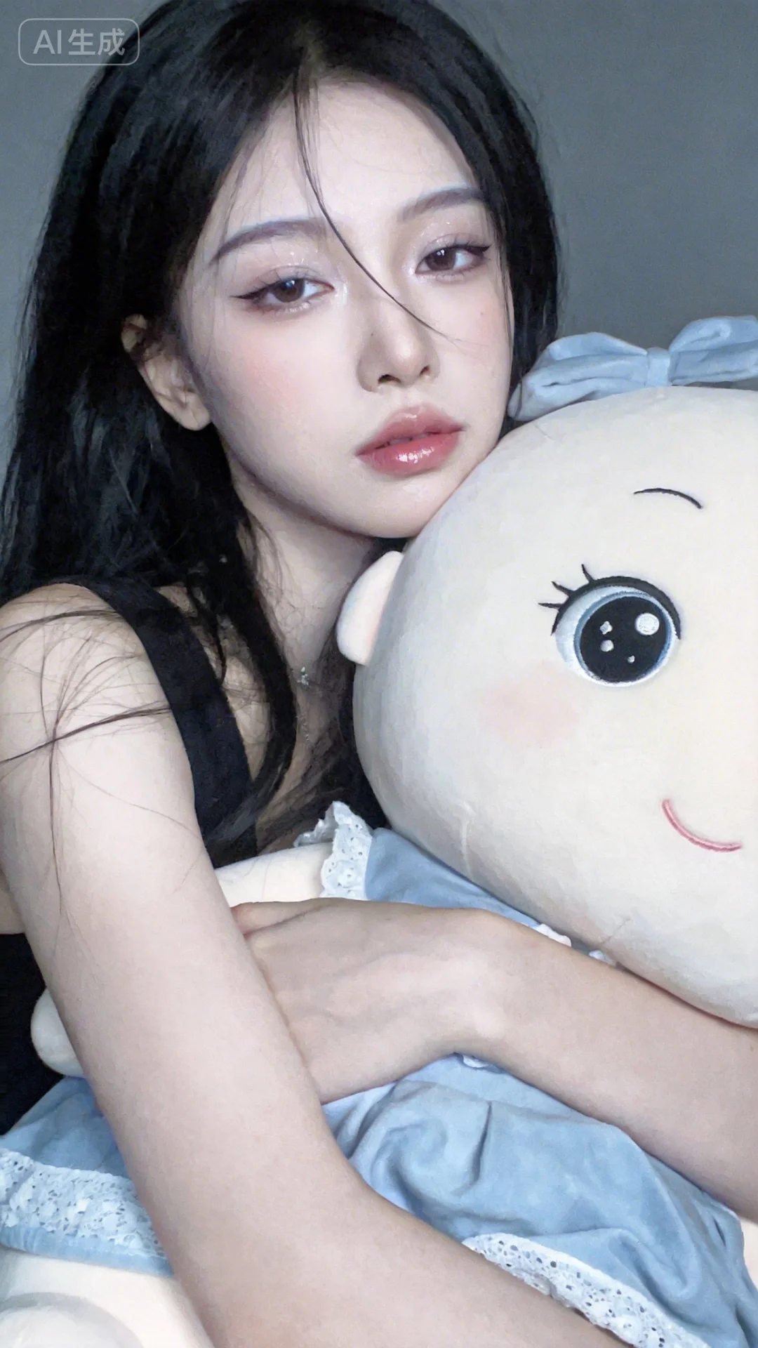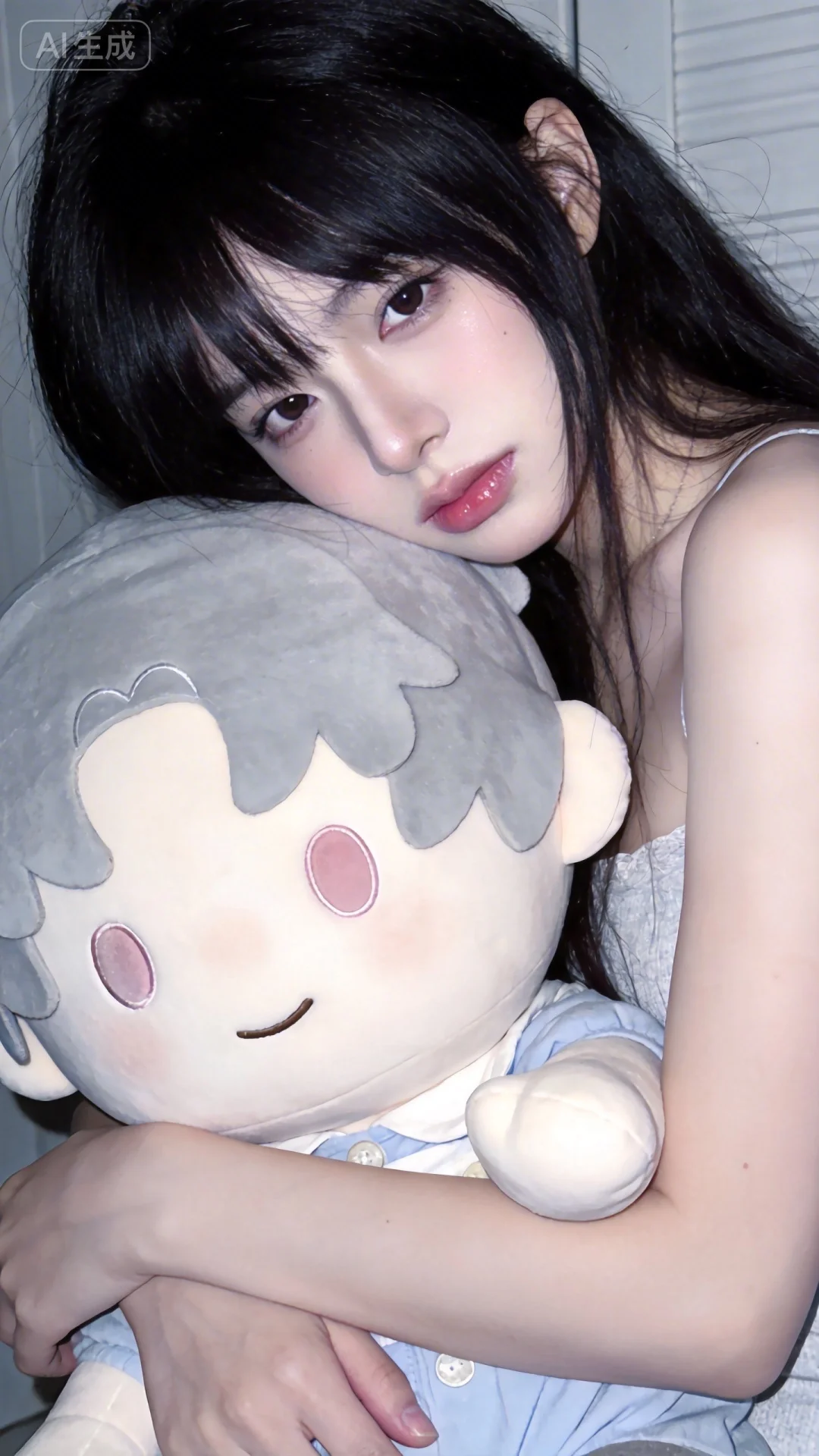 怪诞美学,梦幻,浪漫元素,唯美,空灵,少女抱着巨大的娃娃,近景,半身人像摄影,日常快照风格,非精心构图或打光,上半身特写,神情忧郁妖冶少女,冷白皮,时尚穿搭,瓜子脸尖下巴,皮肤白皙,底妆通透,肤色均匀自然,纯欲风。,发丝清晰可见,皮肤白皙,底妆通透,肤色均匀自然,纯欲风。光线柔和自然,非均匀打光,表情自然松弛,照片毫无修饰感,带有生活真实感。ccd拍照感,iphone实拍,真人,真实生活,