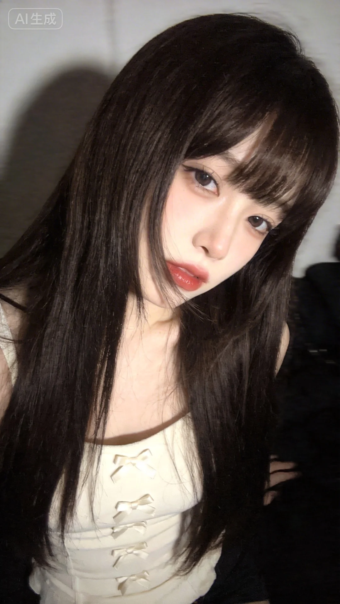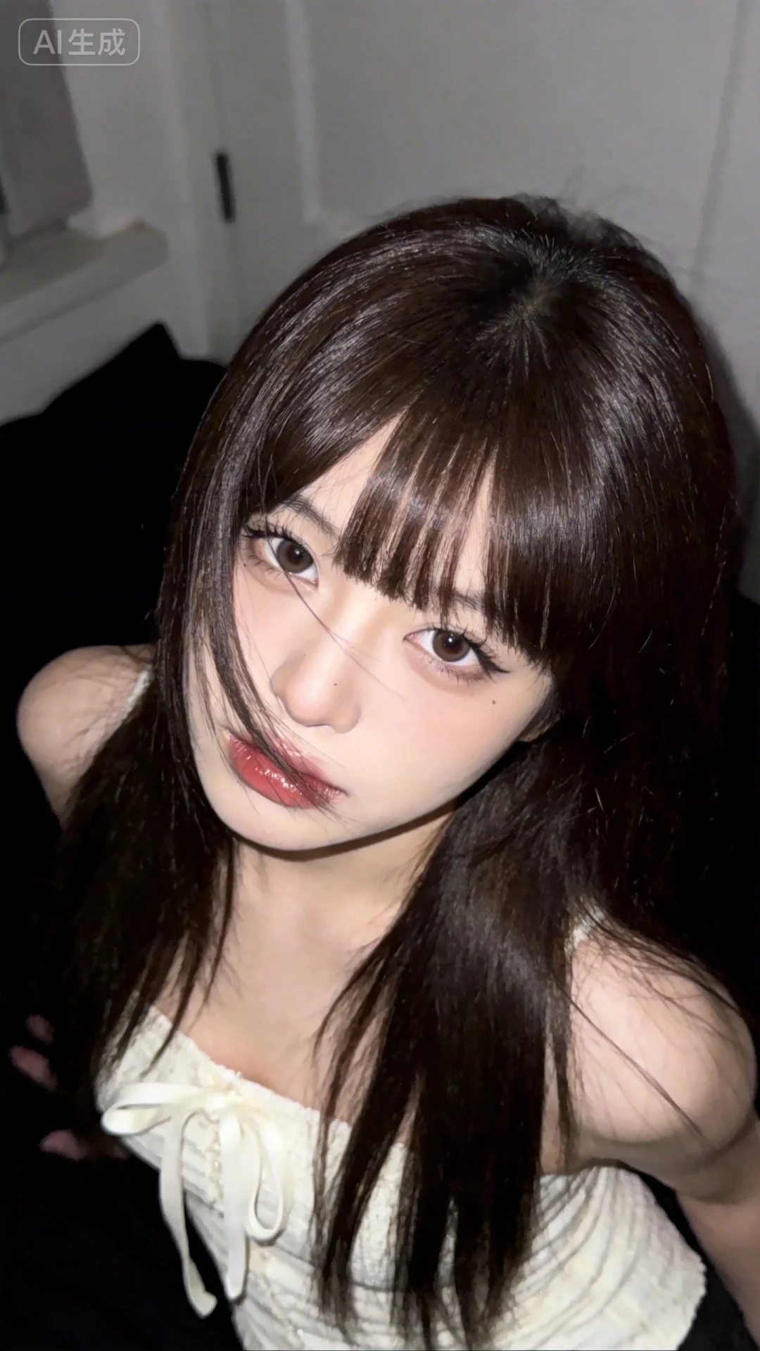 韩系Instagram博主风视觉风格的照片,运用韩式滤镜,呈现出网感少女风格,具备少女感网拍、概念风美学的网感照的特色。主体是一位超高颜值的美少女,冷白皮瓷白肌肤与奶油白肌肤,微醺的神态,精致韩妆下表情清冷又带一丝欲望,似洋娃娃般可爱。深棕色的唯美长发柔顺有光泽,八字刘海搭配两侧遮脸直发垂落肩头,显脸小且营造出发丝轻抚脸颊的画面感,发丝柔光感强烈。她穿着米白色带蝴蝶结装饰的修身上衣,从微俯视角看,她散发着自然松弛、慵懒的氛围感。背景是低饱和且模糊的浅白室内居家环境,以自然光线结合暖调滤镜与氛围感滤镜,脸部轻微曝光,画面柔焦朦胧,有光影氛围感、低饱和氛围感、松弛慵懒感等多重氛围。照片是低像素的随手一拍快照形式,整体色彩以黑棕为主,暖光点缀增添柔和,遵循质感弱化、情绪具象、意境优先、简约克制、氛围感主导的美学,聚焦眼睛突出情绪氛围,暗调沉敛又有暖调治愈,清透疏离又有暗调静谧和空境松弛,面部神态清冷带微甜,画面层次分明、质感高级。