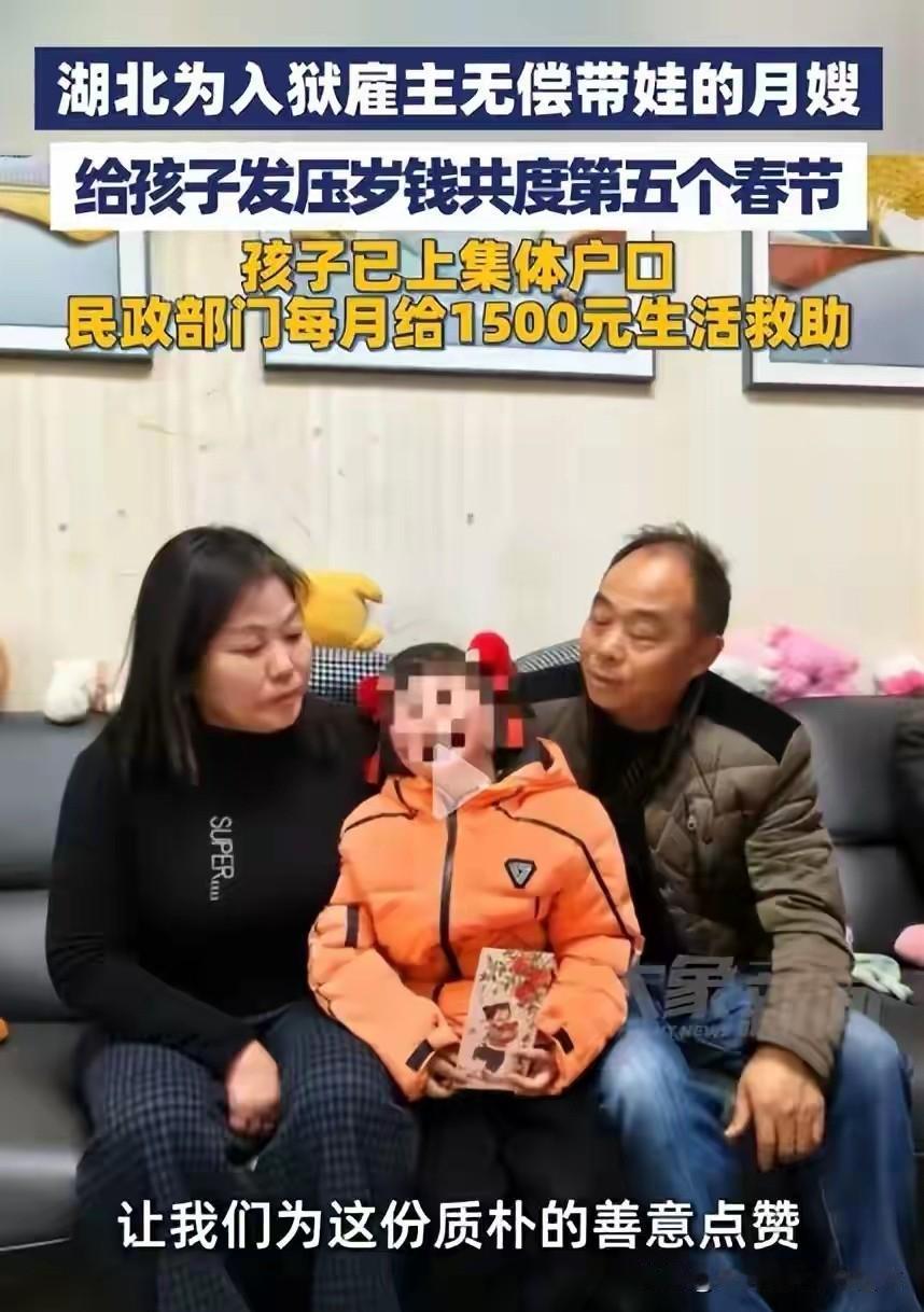 看哭!湖北月嫂无偿带娃5年,不是亲人却胜似亲人 马年春节,黄姐一家又带着“奶娃”买新衣、过新年。 这已经是孩子跟着她,度过的第五个春节。 2021年,黄姐在武汉做月嫂,照顾一名一岁多的女婴。 仅仅两个月,雇主失联,房租到期,无人过问,孩子瞬间成了无依无靠的孤儿。 她本可以转身离开,却选择把孩子抱回了家。 这一抱,就是五年。 后来才知道: 孩子名义上的父亲在服刑,且无血缘; 亲生母亲也在服刑,从未尽过一天母亲责任。 两个至亲之人双双缺位,是黄姐用最朴素的善良,撑起了孩子的整个童年。 五年不离不弃,五年无偿付出,不是血缘,却早已是一家人。 世界很冷,但黄姐很暖。 愿这个被温柔守护的孩子,永远平安快乐; 愿善良的黄姐一家,一生顺遂,被时光温柔以待。