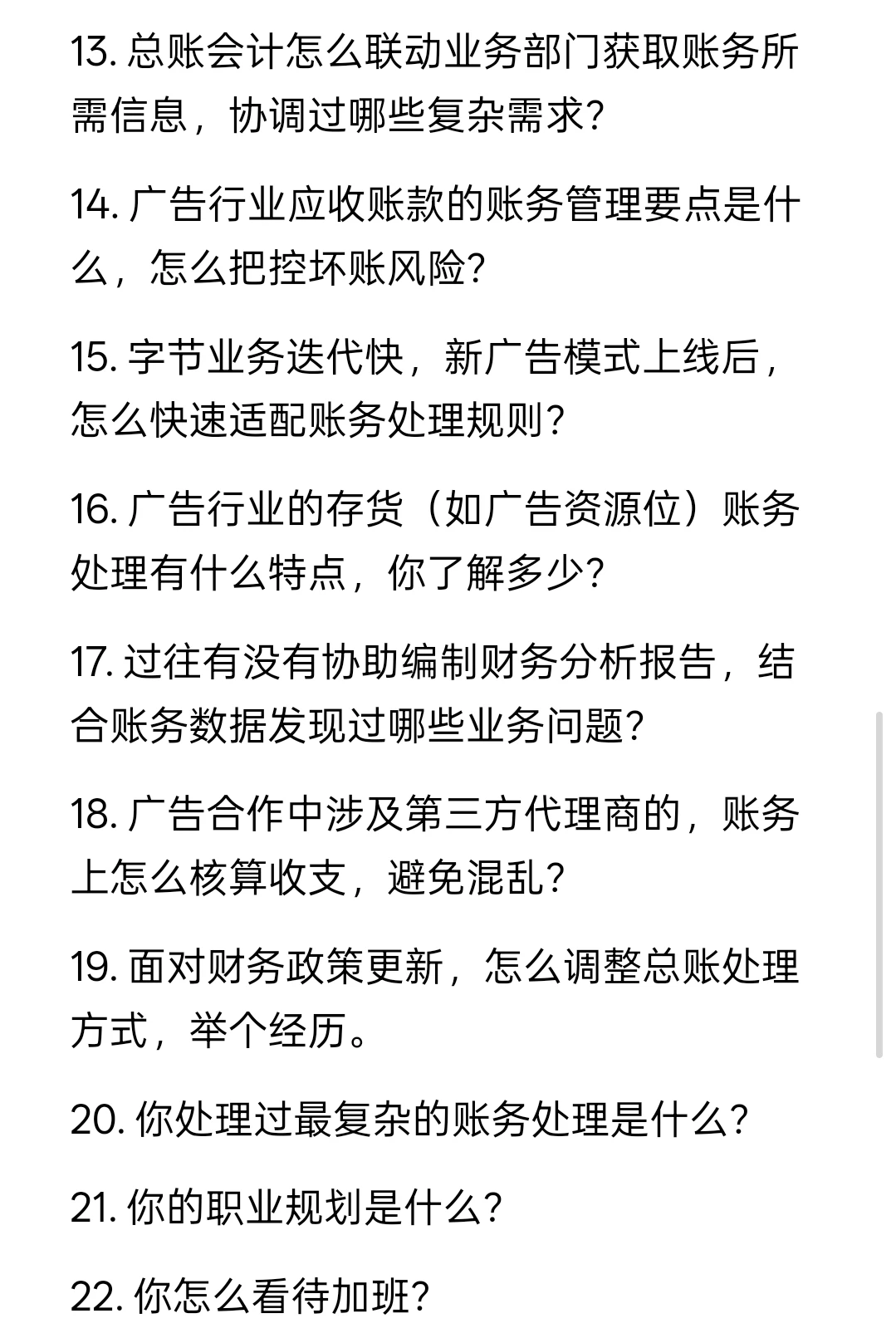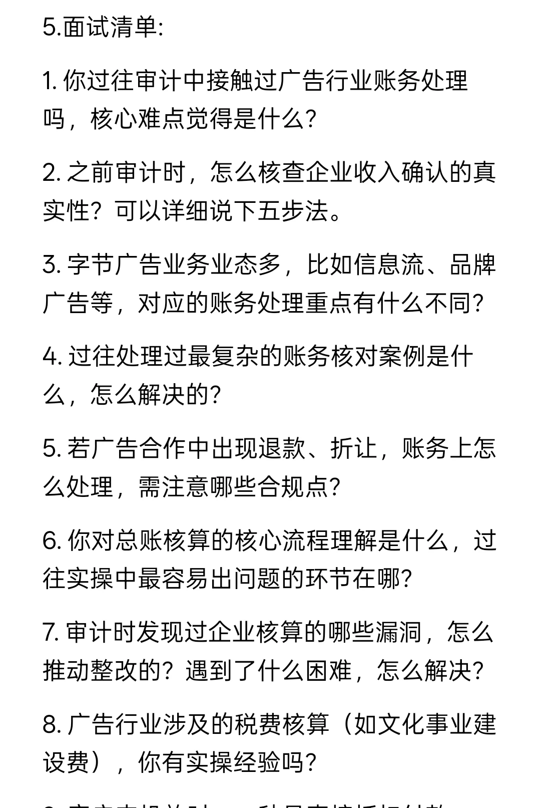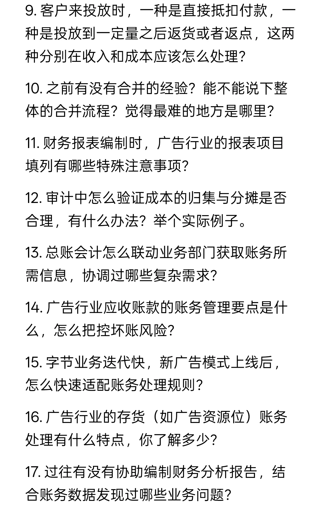 1. 你过往审计中接触过广告行业账务处理吗,核心难点觉得是什么?