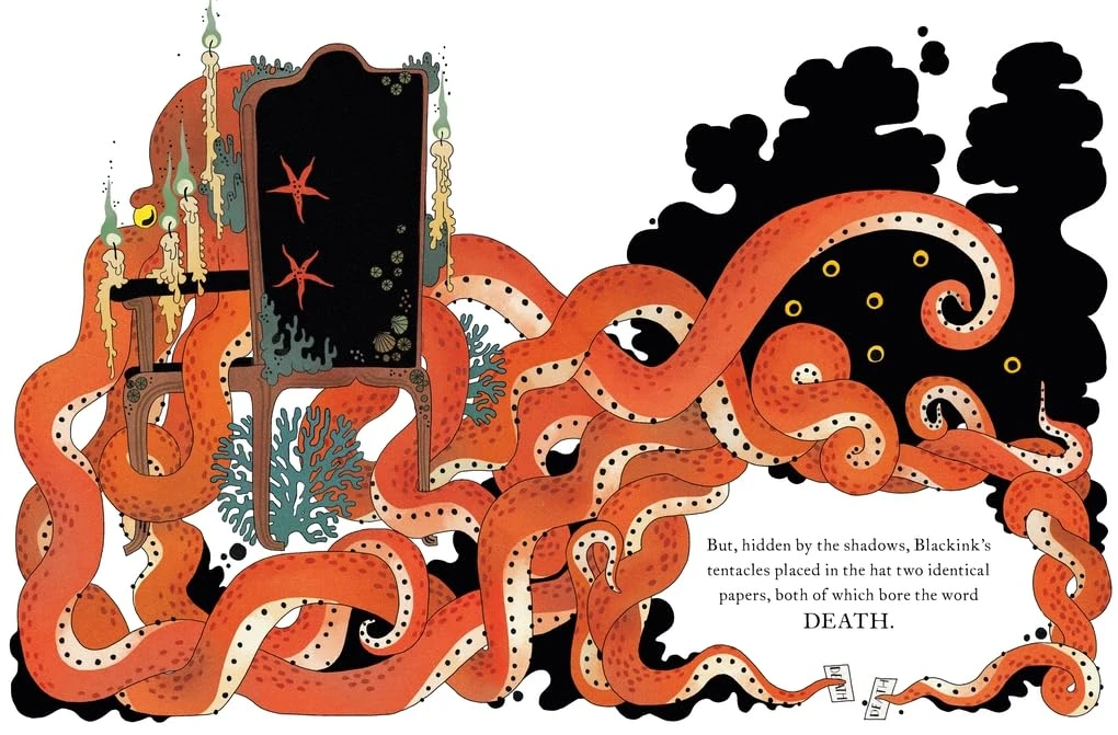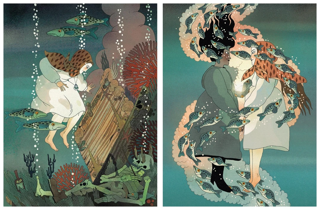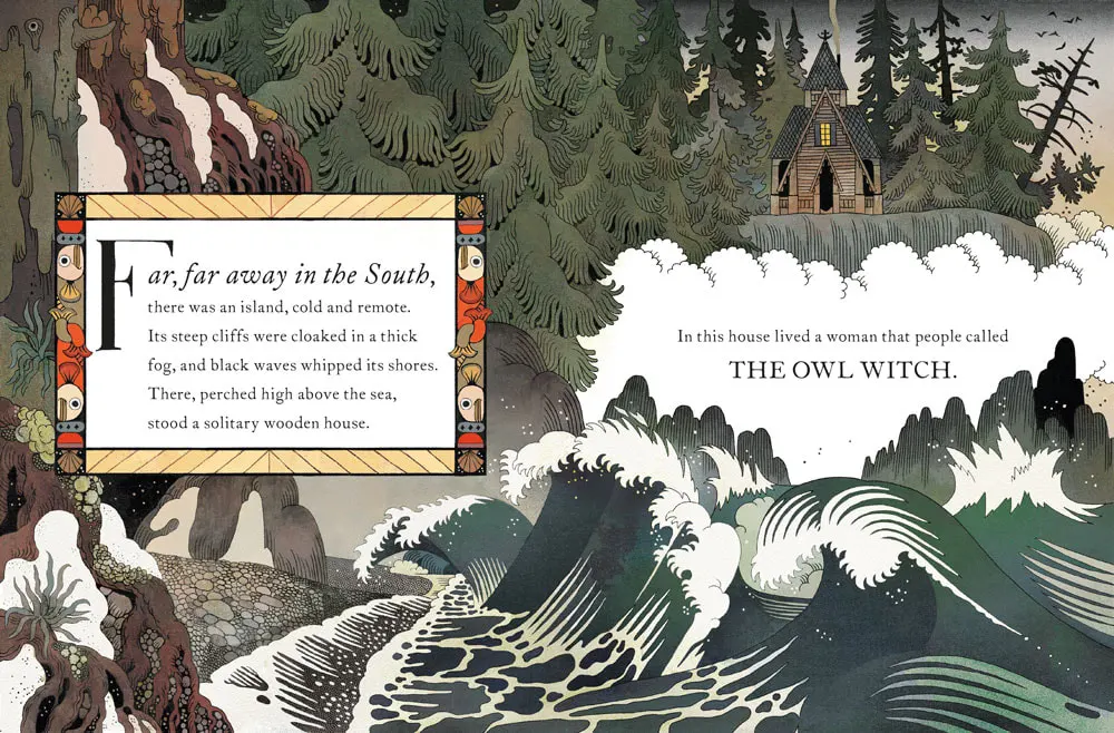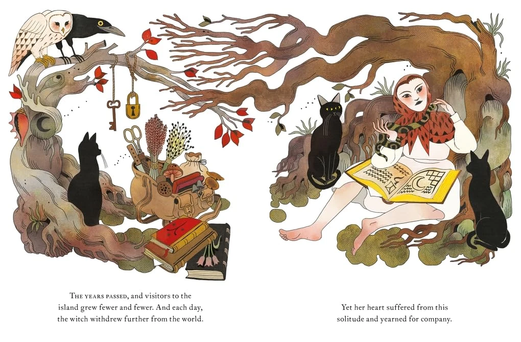 Júlia Sardà 以其标志性的细腻笔触和独特画风,为故事中的孤岛、神秘的房屋、威严的黑墨水以及充满神秘色彩的猫头鹰女巫,勾勒出逼真且氛围感十足的场景,将读者带入一个奇幻又神秘的世界 。