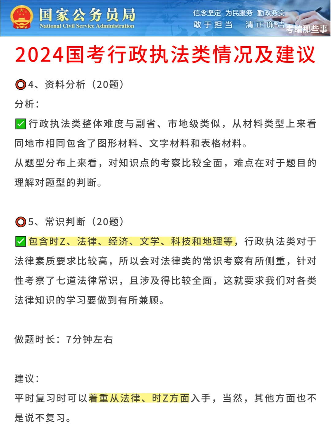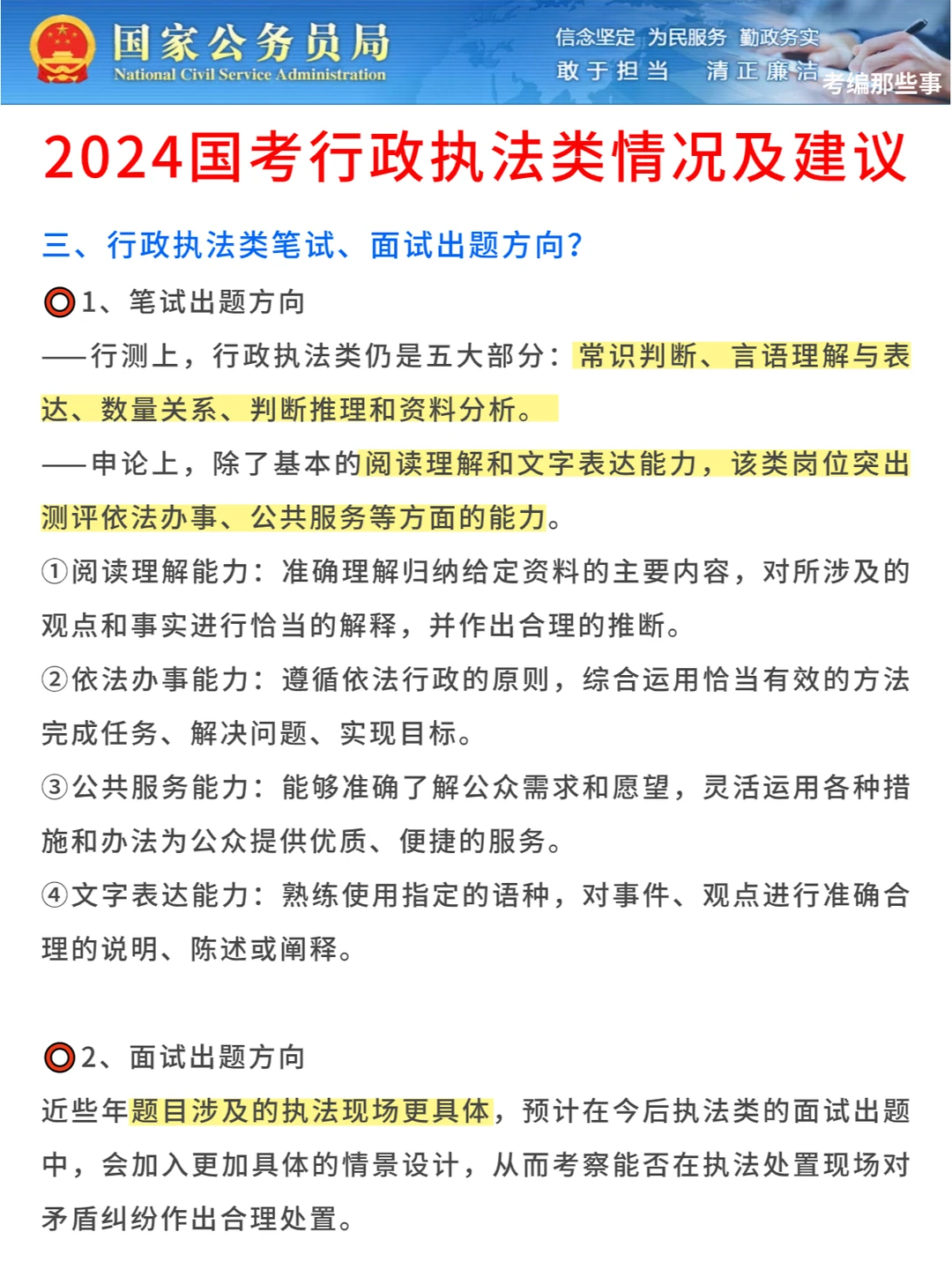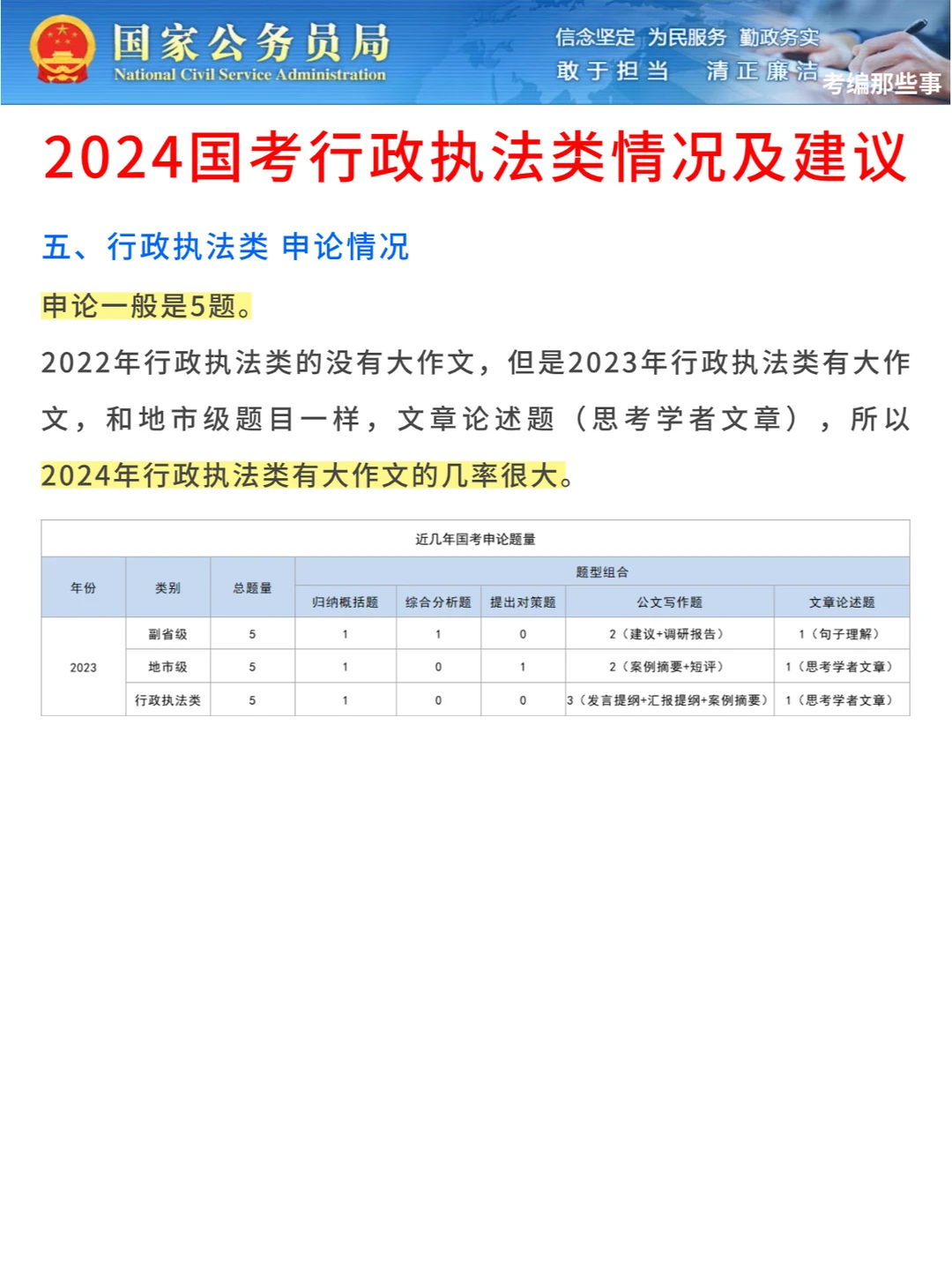 无论是副省级、市地级还是行政执法类,都是5道题,其中副省级和地市级包括4道小题和1道大作文,2022年行政执法类的没有大作文,但是2023年行政执法类有大作文,和地市级题目一样,文章论述题(思考学者文章),所以2024年行政执法类有大作文的几率很大。