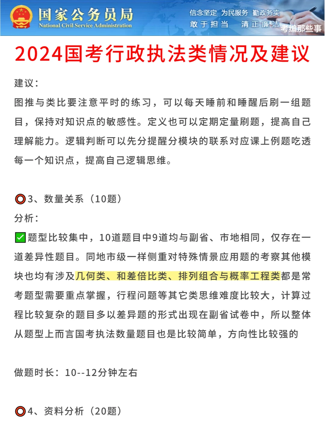 就数量关系而言,行政执法类与地市级数量一致,均为10道,题型也与往年无较大差别,包括基础计算问题、基础应用题、行程问题、经济利润问题、几何问题、概率问题等。