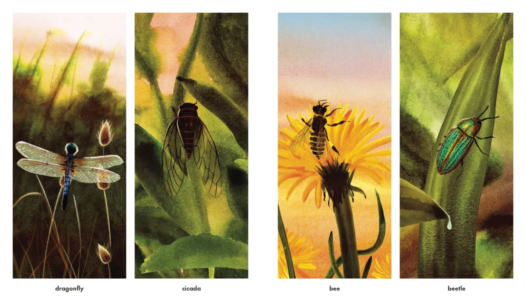 动物、植物、云朵和天空都苏醒过来,世界变得生机勃勃。鹿在饮水,猫头鹰醒来,蒲公英在阳光下闪烁,瓢虫爬行,鱼儿跳跃,鸟儿齐声鸣叫,大雁列队飞走,花朵绽放。