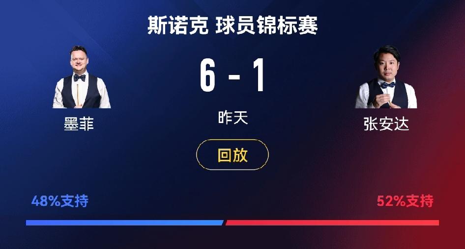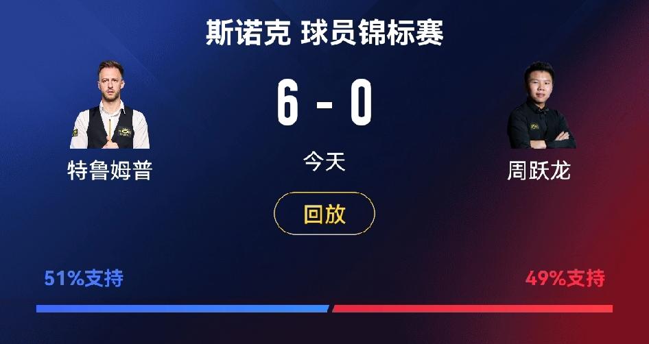周跃龙0-6惨负小特,张安达1-6负墨菲 球员锦标赛,今日再续战, 凌晨三点战,冠军斗冠军 果栋二比六,韦克林晋级。 [流泪] 晚间九点赛,中国两人战, 周跃龙出场,迎世界第一, 特鲁姆普勇,半场四比零, 休息回来战,又连负二局, 比分六比零,挥拳哥惨败。 [流泪][流泪][流泪] 达仔战墨菲,开局遭连鞭, 半场零比四,直追周跃龙。 休息回来战,达仔扳一局, 墨菲不示弱,再胜五比一, 先拿到赛点,达仔陷绝境, 七局墨菲先,六十六超分, 安达做斯诺,未果一比六。 [流泪] 中国队五人,首轮已折四, 让人想不到,损兵又折将, 凌晨三点战,赵心童出场, 是否能晋级,还看赵公子。 [笑哭]