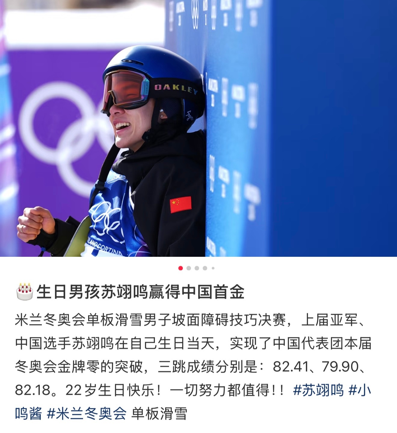 苏翊鸣金牌中国米兰冬奥首金生日快乐!首金!太优秀了