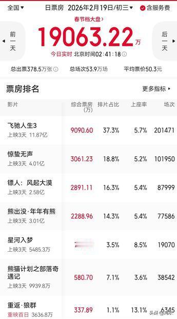 春节档电影观察二十:今天是大年初三,电影市场的票房大战正进行得如火如荼。 受昨日上座率等因素的影响,今天的电影排片,《飞驰人生3》微涨,继续保持领跑地位;《熊出没年年有熊》持平;《惊蛰无声》从21.1%减少至18.8%,小幅下降;《星河入梦》本来排片占比不占优势,但再次微降。 不过,《熊猫计划之部落奇遇记》从9%下降至7.1%,全国拍映场次减少了上万场次,属于几部电影中降幅比较明显的一部,核心原因还是该片昨日的上座率在几部电影中垫底。 比较出乎意料的是,《镖人:风起大漠》经历了昨日的排片下降之后,今天的排片占比涨幅明显,从昨日的14.3%上涨至16.3%,全国拍映场次增加近万场次。这对于该片而言,无疑是一大利好,有利于后市票房的持续性。 鸿水说