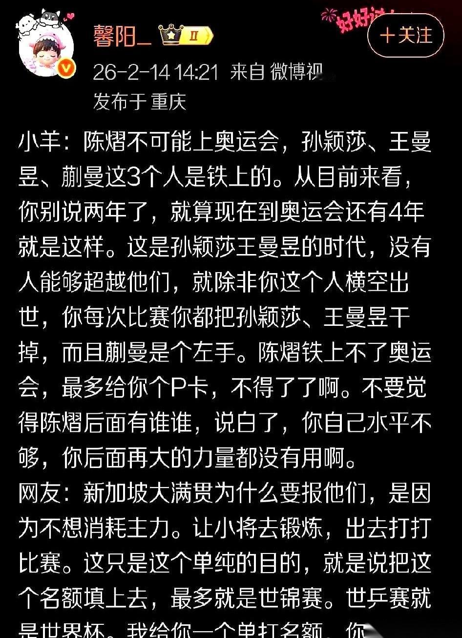 陈熠最近打得有多猛,懂球的都看在眼里。眼看排名往上冲,巴黎的门票好像伸手就能摸到。 但教练组的眼神,却越过了她,落在了另一个人身上。 就因为一只左手。 蒯曼的那只左手,就像一把万能钥匙。往混双里一插,活了。往女双里一放,也活了。整个队伍的排兵布阵,瞬间多出好几套致命的打法。 这是陈熠拿命也换不来的东西。 有人不服,说这不公平。凭什么几个月的汗水,就败给了一只天生的左手? 可教练组的桌上,摊开的是另一本账。他们翻过一页又一页的战绩表,手指最终停在了一个地方——对外战绩。那几场硬仗,谁能从国外那几个主要对手嘴里啃下分,数据清清楚楚,一笔一划写得明明白白。 说白了,竞技体育有时候就像解一道数学题。你用再漂亮的姿势,写满三页草稿纸,但人家的解法,就是那个唯一正确的标准答案。