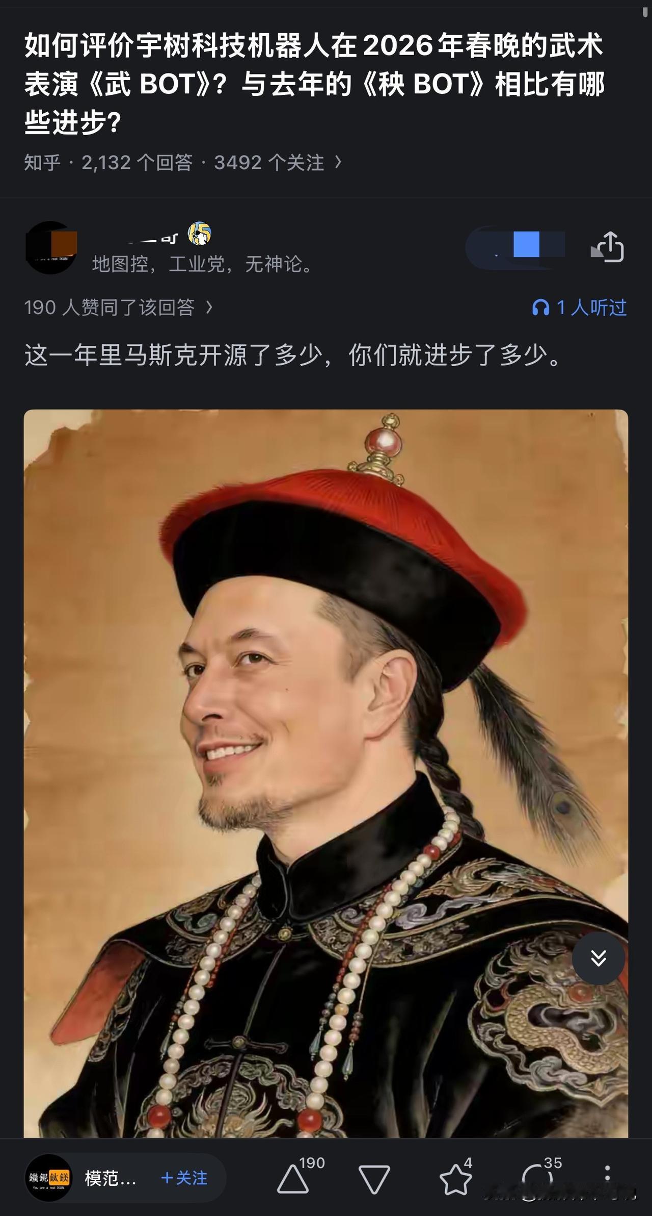 快来看看这是不是钓鱼帖,我有点拿不准了!最近有个关于春晚机器人表演的帖子,大概就是比较这一年我国机器人的进步情况。然后一位网友回复说“这一年里马斯克开源了多少,你们就进步了多少。”还配了一张马斯克的Ai古装头像。于是评论区的网友们就来劲了,纷纷排队回复:1、可惜马圣只开源中文版,没开源英文版。2、马圣有颗中国心。3、马圣马年多勤勉,勤学中文为开源。4、今年可是马年,没有马斯克开源能有马年吗?……有的甚至还说马斯克的老妈妈生活在中国是“质子”,能不向中国开源吗?我之所以不能判断这位博主是不是钓鱼,就是他的文案错漏太明显了,但凡有点儿常识都知道这家伙在胡说八道,但他说话的方式又太认真了。这个简直比达利安造船厂还让人迷糊!记录我的2026