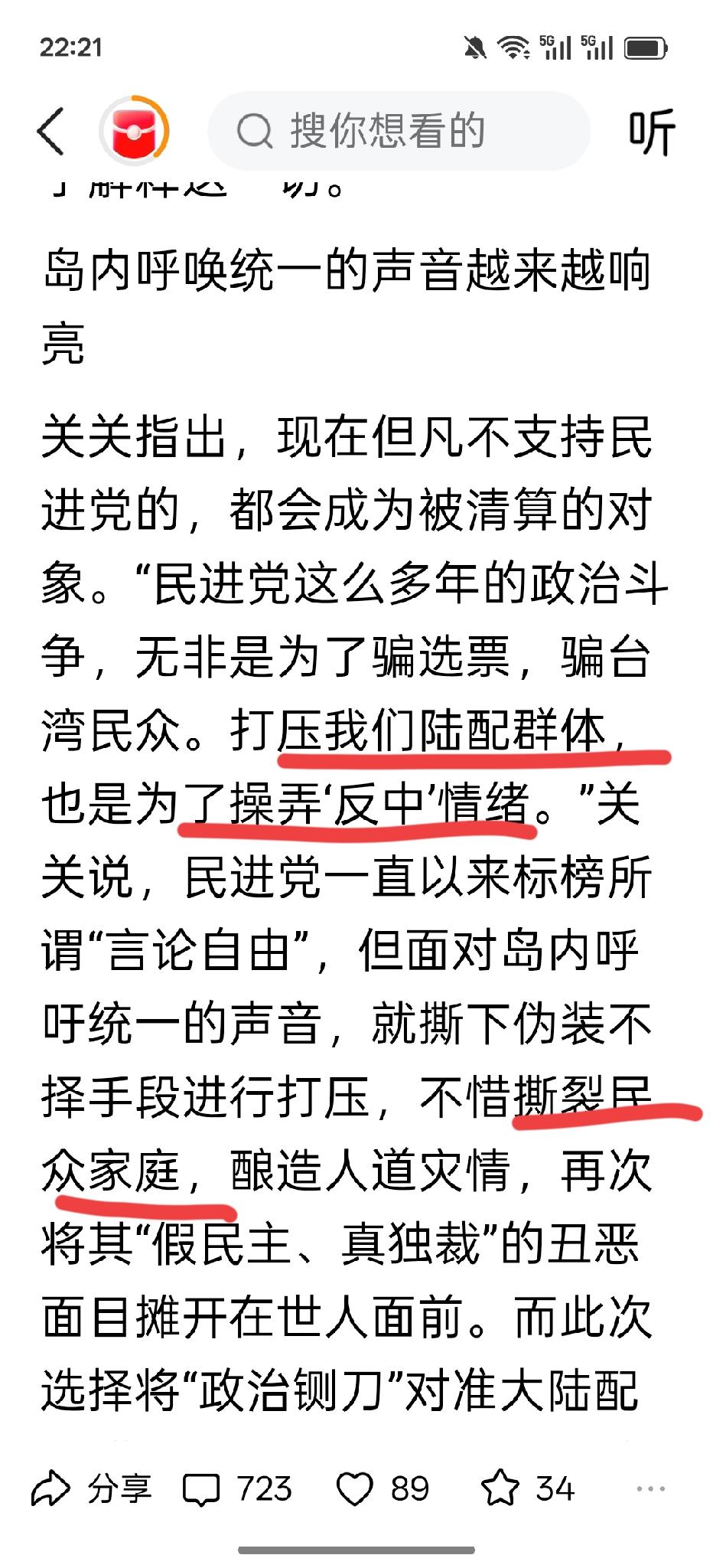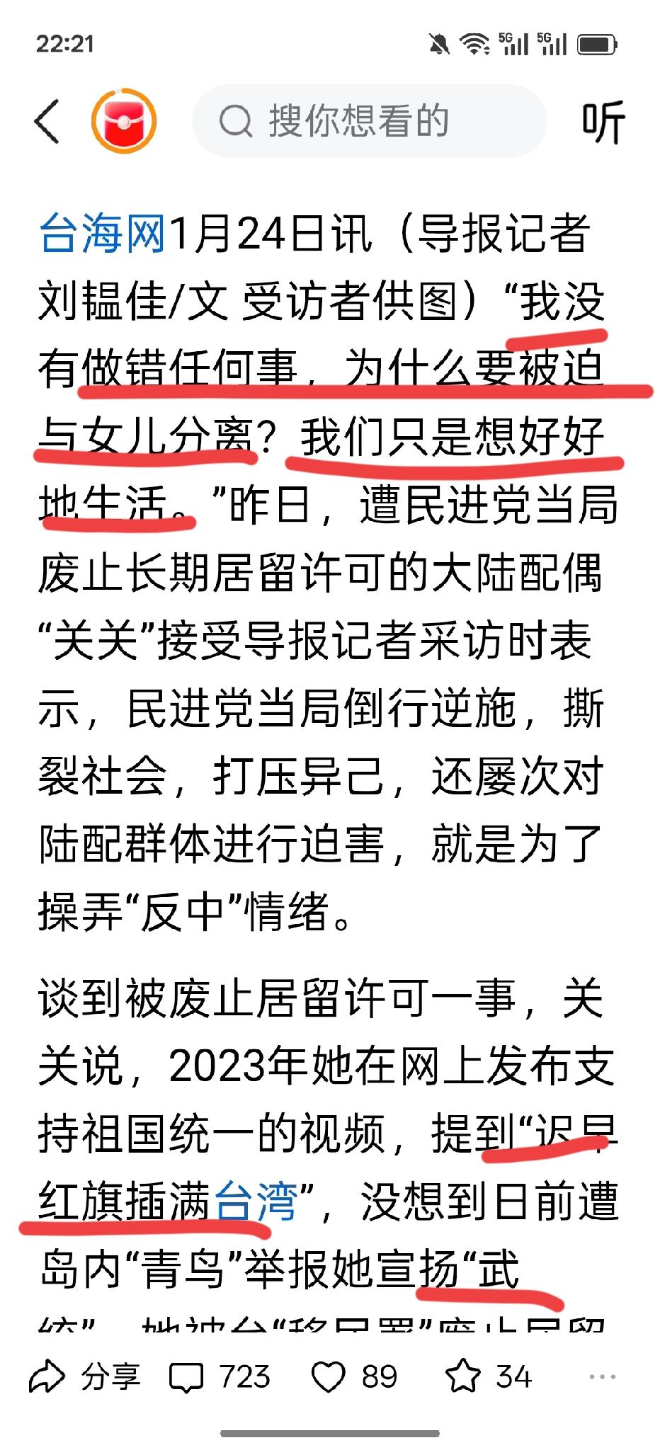 又一位陆配被骨肉分离了? 最近湾湾当局取消了一位陆配关关的居留许可,关关只好孤身一人返回内地,与丈夫和女儿分开了。 关关在湾湾生活了近十年,一直是位关心政治的女士。她前年提出"红旗早晚插遍全岛”,引起了当局的重视,再加上宣扬武桶,更引起了当局的愤怒。 关关认为自己没错,是对方在迫害自己,害的自己骨肉分离。记得之前有位亚亚,也是因为这个原因,被迫返回内地。最近我也没刷到过她,回来以后不知在忙什么? 她俩个的做法我有一点不明的,既然跟湾湾闹掰了,为什么不全家一起回来,为什么还要待在那里,忍受骨肉分离的痛苦? 这倒底有什么原因?