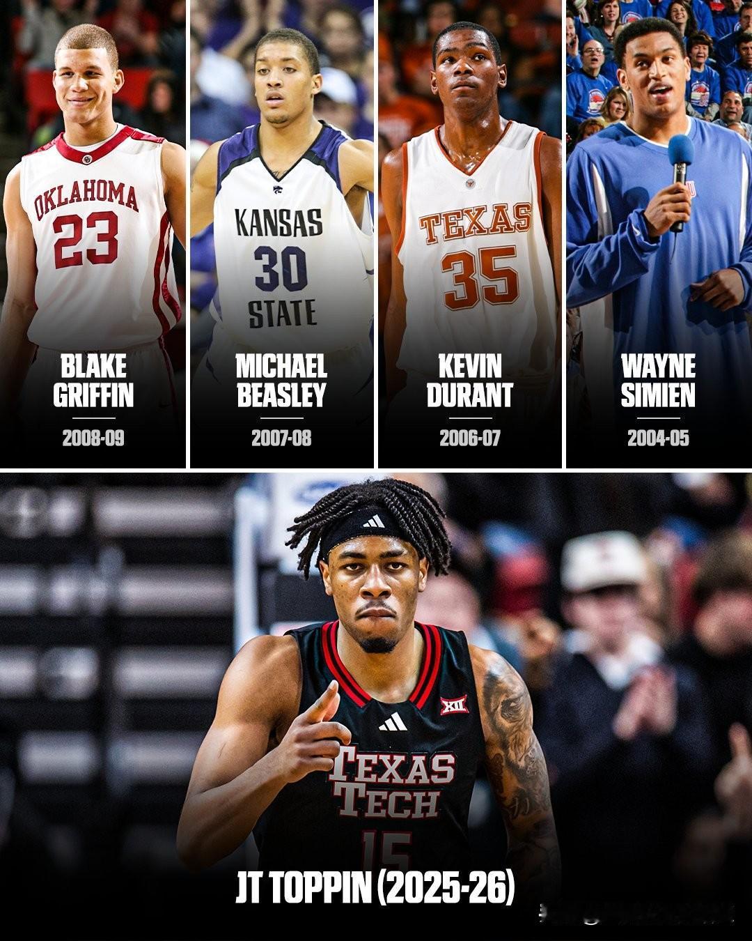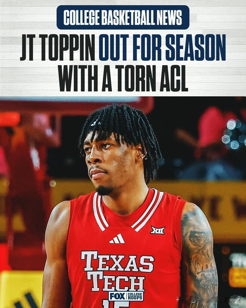 德州理工前锋JT Toppin在输给亚利桑那州立的比赛中右膝ACL前交叉韧带撕裂而导致赛季报销,本赛季是仅次于Cameron Boozer的全美最佳球员热门候选者,场均得到21.8分10.8篮板,第五位能够在Big 12联盟场均20分10篮板的球员,之前还有格里芬、比斯利、杜兰特和Wayne Simien。