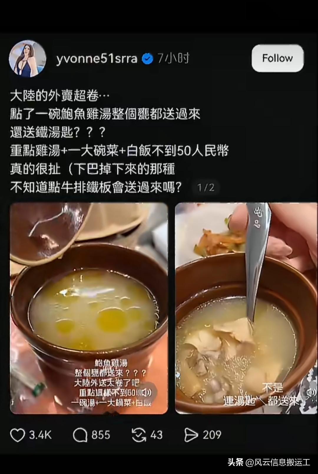一位来大陆旅行的台湾省妹纸,被大陆外卖的价格和包装给震撼到了!