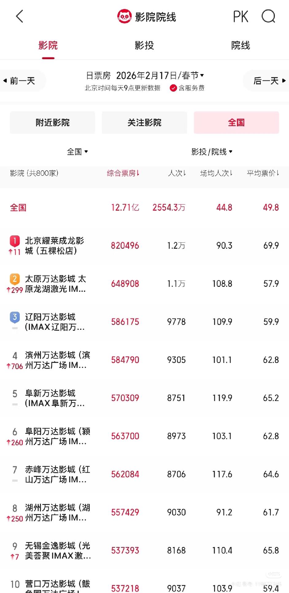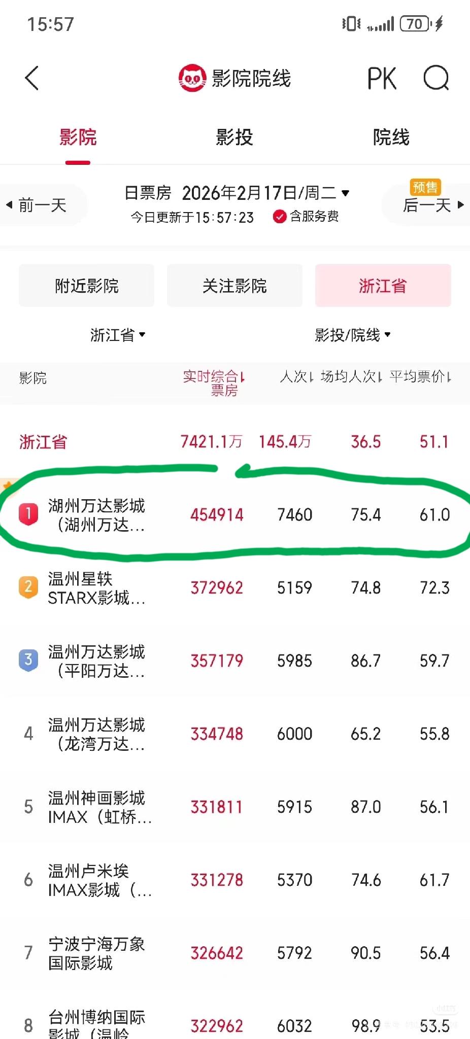 我大湖州也真的是好起来了!2月17日大年初一,湖州万达影城票房高居省内第一,全国前十。 在浙江前八的榜单里面,温州占了5个,宁波一个、台州一个。平均票价最高的是温州星轶影城,场均人次最高的是台州国际博纳影城。湖州万达影城能高居榜首,大概率是开的场次比较多的原因吧! 而全国范围内,北京耀莱成龙影城在大年初一录得82万多的总票房,高居榜首。湖州万达影城以55万多排名第八。果然像湖州这样的三四线小城市,无聊的春节大家只能看电影,其他没啥好玩的!
