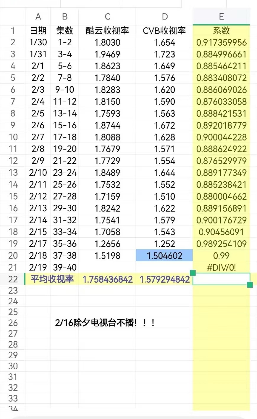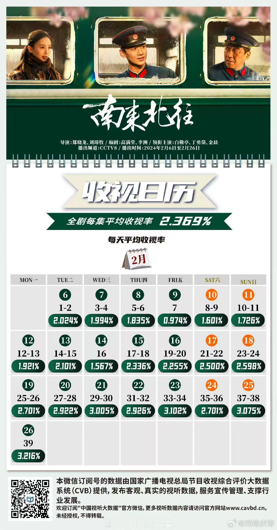 历年除夕档收视率23年狂飙初一22号cvb1.75,初二升回2,真不亏是大爆剧24南来北往大年三十未断更,除夕夜冲击大,初一cvb1.6,初二涨回cvb1.7225年无所畏惧没啥可说的1.5保卫战,初一cvb1.14,初二cvb1.1526年生命树初一cvb1.25,初二cvb1.50,比去年1.5好点其实要是剧本身好除了除夕冲击力大,初一也有但不大,初二基本都会回升到原本水平。不好的说白了就是剧留不到人