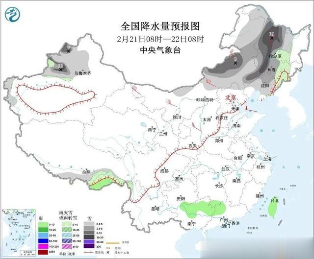 2月21日8时至22日8时,新疆北部、内蒙古东部、东北地区大部、西藏南部等地部分地区有小雪或雨夹雪,其中,新疆塔城和伊犁河谷地区、内蒙古东部、黑龙江中西部、吉林中西部等地部分地区有中到大雪,局地暴雪(10~18毫米)。西藏南部、湖南南部、广西西部和东北部、广东西北部、台湾岛等地部分地区有小雨。内蒙古中部、黑龙江中部、陕西北部等地部分地区有4~6级风,其中,内蒙古中西部部分地区有6~7级风,阵风7~9级。渤海、渤海海峡将有6~8级风、阵风9级,黄海、东海北部海域、北部湾将有5~7级风、阵风7~8级。