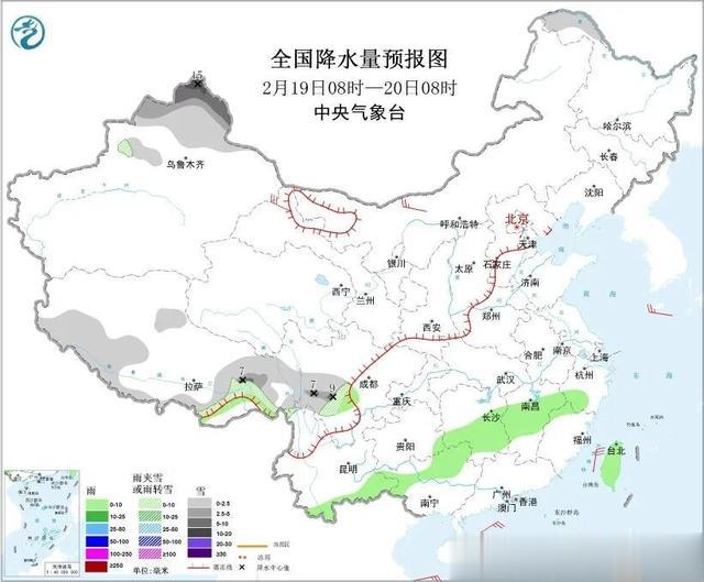 2月19日8时至20日8时,新疆北疆地区、西藏北部和东部、川西高原南部以及黑龙江西北部等地部分地区有小雪或雨夹雪,其中,新疆阿勒泰地区、西藏东南部、川西高原南部等地部分地区有中到大雪,阿勒泰地区部分地区暴雪(10~15毫米)。西藏东南部、湖南中南部、江西中北部、浙江中南部、福建西北部、四川盆地西南部、贵州东南部、云南南部、广西西部和北部、台湾岛等地部分地区有小雨。内蒙古西北部、甘肃北部等地部分地区有4~6级风,阵风7~8级。台湾海峡、巴士海峡、南海西部和东部海域将有4~7级风、阵风7~8级。