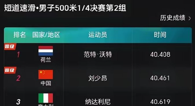 林孝埈、刘少昂无缘A组决赛,中国短道速滑军团全军覆没! 北京时间2月19日凌晨,米兰冬奥会短道速滑男子500米进行了1/4决赛和半决赛。 1/4决赛,刘少昂第二组出战,以40秒461的成绩小组第二晋级半决赛。 另一组出战的林孝俊,以40秒638的成绩,小组第三,无缘半决赛。 半决赛中,位于第2小组的刘少昂滑出1分10秒008的成绩,以小组第五晋级B组半决赛。 刘少昂、林孝俊无缘A组半决赛,宣告着本届冬奥会中国男子短道速滑队将以0金收官。