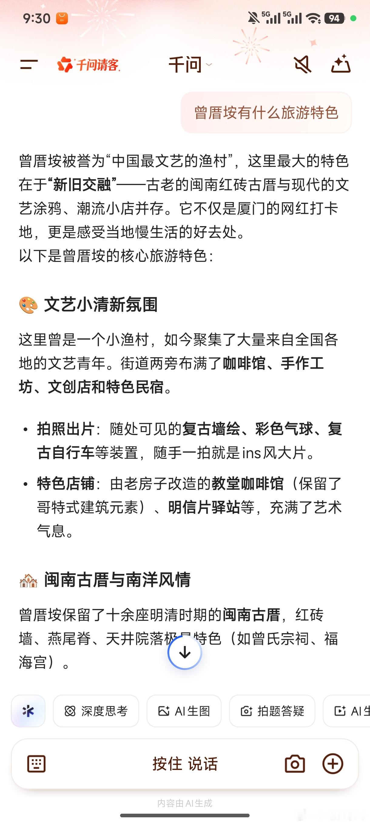 AI的普及让很多之前的难点问题变得越来越简单,比如说家里老人出门,之前都要费尽心机安排好各种行程,今年春节最大的感受就是不需要了,习惯了在千问上买奶茶买鸡蛋的老人,在老朋友之间传播新玩法的速度也远超想象,就像这次带了老人来厦门过春节,最大的感受就是老爸老妈不需要我来安排行程了,只要知道几个点,千问就能安排的明明白白,甚至于很多问题都不需要我来解答,老人早就学会了网上自己和AI对话了。