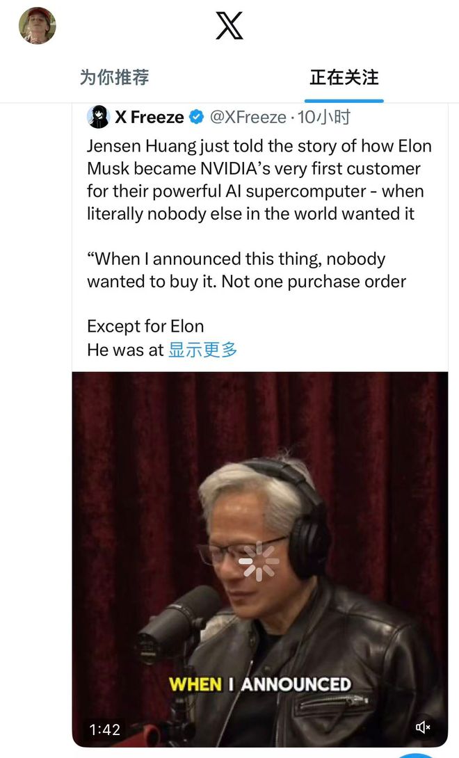 当地时间2月18日,特斯拉(TSLA.US)CEO马斯克在社交平台X上转发帖子显示,英伟达(NVDA.US)CEO黄仁勋讲述了马斯克如何成为英伟达首位购买其强大人工智能超级计算机客户的故事,而当时世界上几乎没人想要这台计算机。