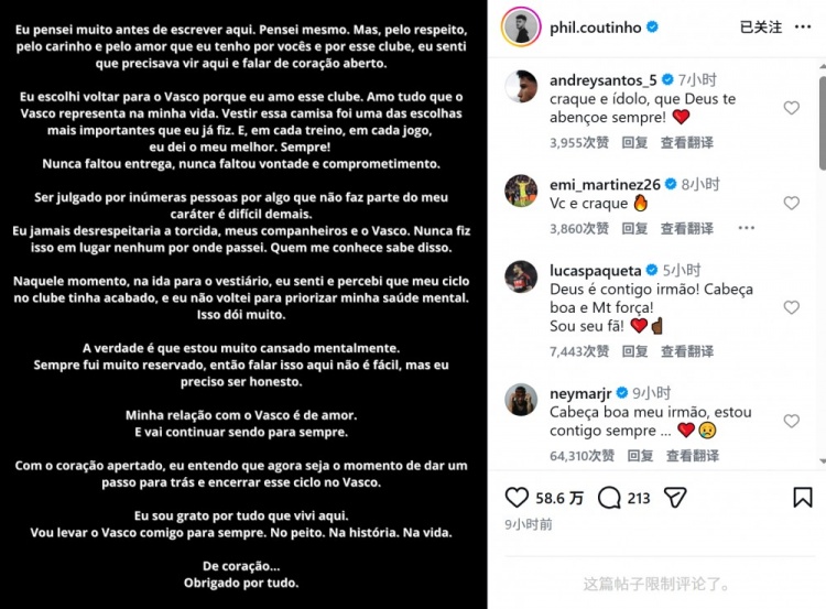 直播吧2月19日讯33岁巴西中场库蒂尼奥与瓦斯科达伽马解约,他在社交媒体上发文谈到了解约的原因,库蒂尼奥因外界的批评而精神疲惫,决定结束这段旅程。