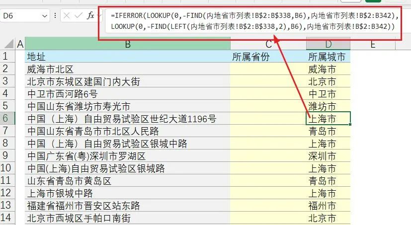 =LOOKUP(0,-FIND(内地省市列表!B$2:B$338,B2),内地省市列表!B$2:B338)