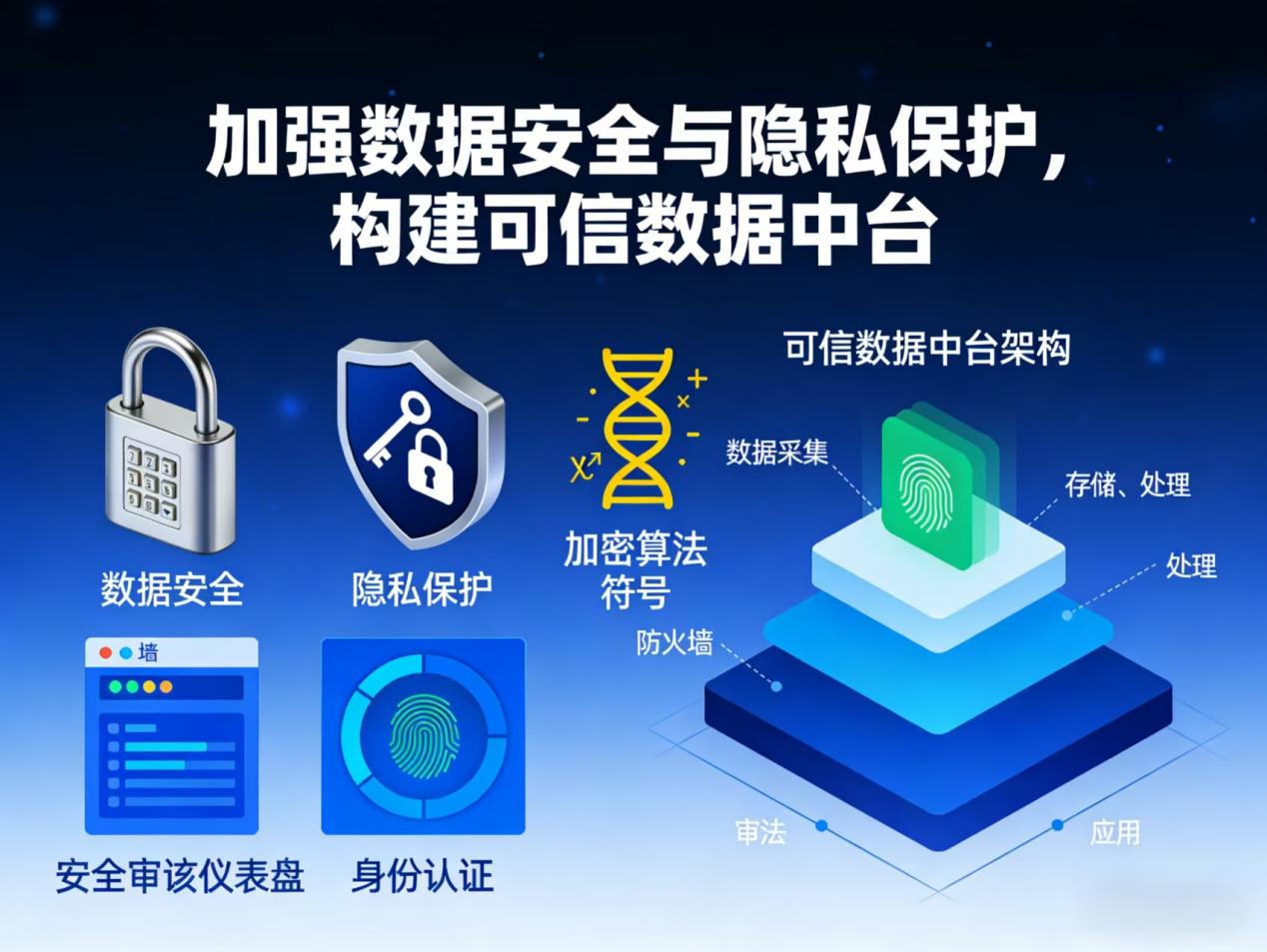 四、加强数据安全与隐私保护,构建可信数据中台1、数据安全与隐私保护的重要性随着数据泄露和网络攻击事件的频发,数据安全与隐私保护成为企业和政府关注的重点。“十五五”规划建议也强调,要统筹发展和安全,确保数据安全和个人隐私不受侵犯。