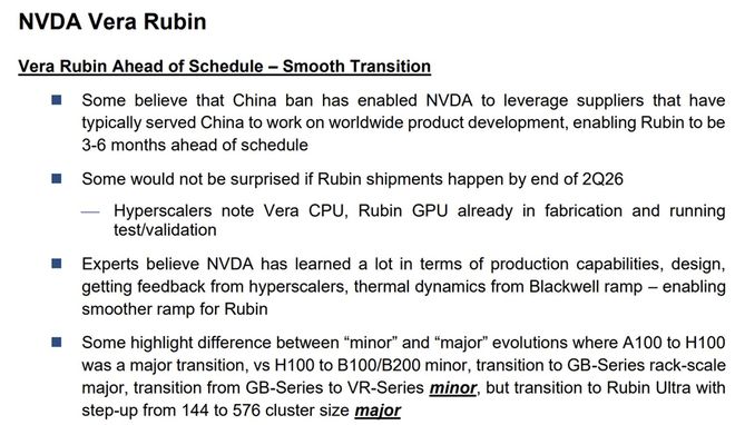 据华尔街见闻此前文章,Evercore的调研还指出了产品代际演进的差异,一些业内人士强调了"minor"(小幅演进)和"major"(大幅演进)之间的区别。其中从H100到B100/B200被视为minor过渡,而到GB-Series机架级系统是major演进,从GB-Series到VR-Series是minor,但到RubinUltra的过渡伴随着集群规模从144扩大到576则是major升级。