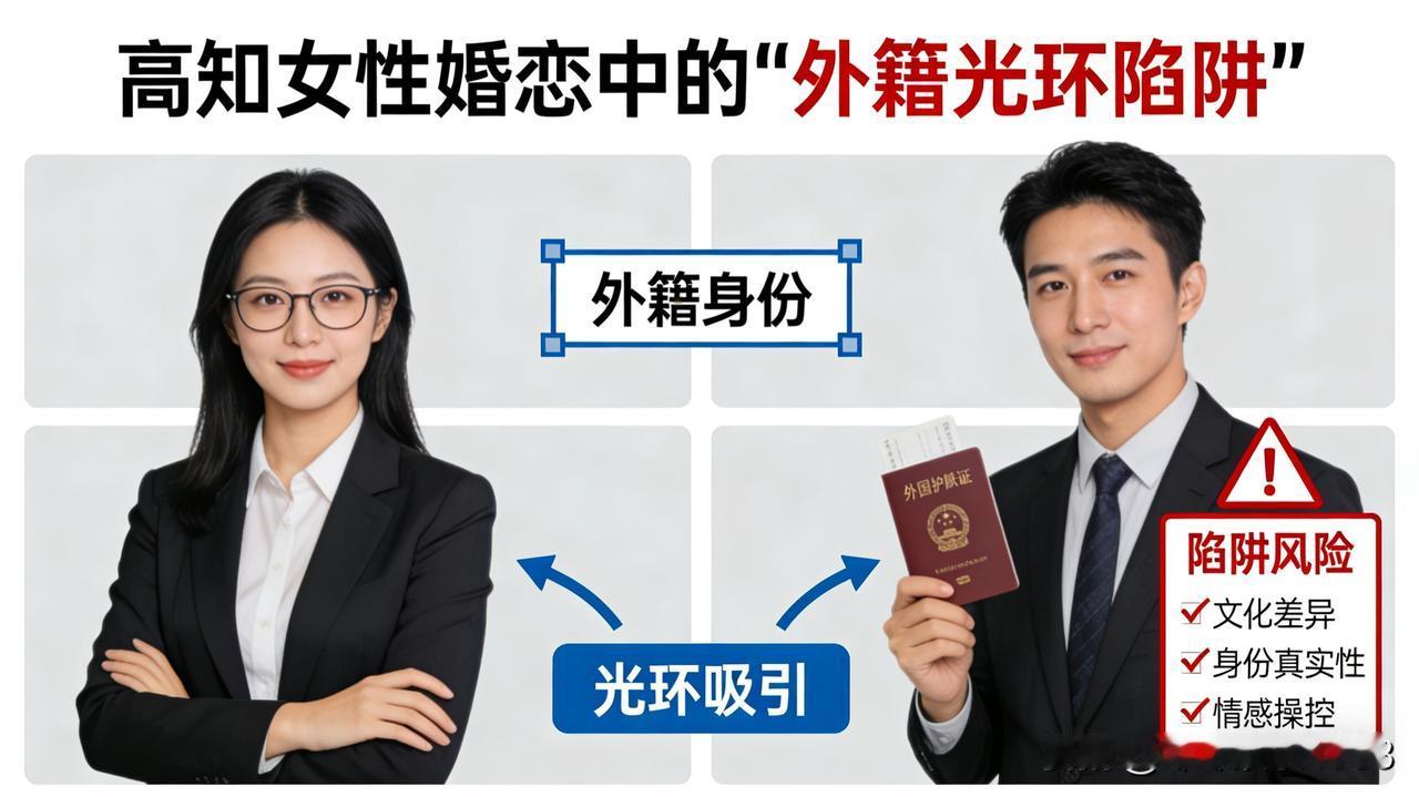 上海一位知名企业高管,因迷恋新西兰某服务员的 “外籍身份”,冲动辞职远赴异国,最终却落得被无情抛弃的结局。这位高管的经历并非孤例 —— 现实中,不少高知女性在婚恋中,常将 “外籍”“异域” 等身份符号当作爱情滤镜,把 “身份标签” 误认成真爱的标配。 这类择偶倾向常源于 “光环效应”:将 “外籍” 标签等同于 “优质”,忽视对内在品质、价值观的考察,尤其当自身社会地位较高时,反而更容易在感情中陷入 “错位选择”。最终,当 “光环” 褪去,破碎的不仅是爱情幻梦,更是对自我情感需求的盲目信任。 这个故事敲响警钟:爱情是灵魂共鸣,而非身份崇拜。过度迷恋 “外籍符号”,本质是对内在品质的信任缺失,更是对自我情感需求的错位投射。真正的安全感,永远来自于对他人灵魂的深刻认知,而非一张 “身份证书”。