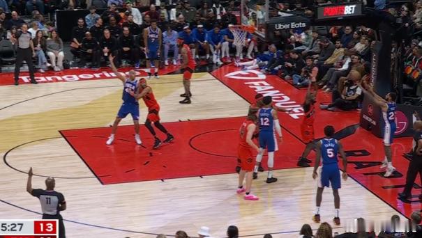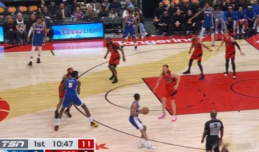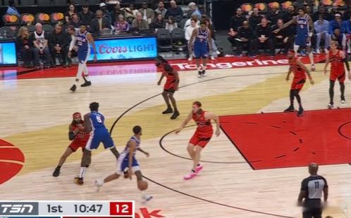 9、10、11、12佩恩底线发球给高位拿球发牌的巴图姆后,立即借助队友两重无球掩护摆脱追防人兜至底角,空位接球三分空心入网。