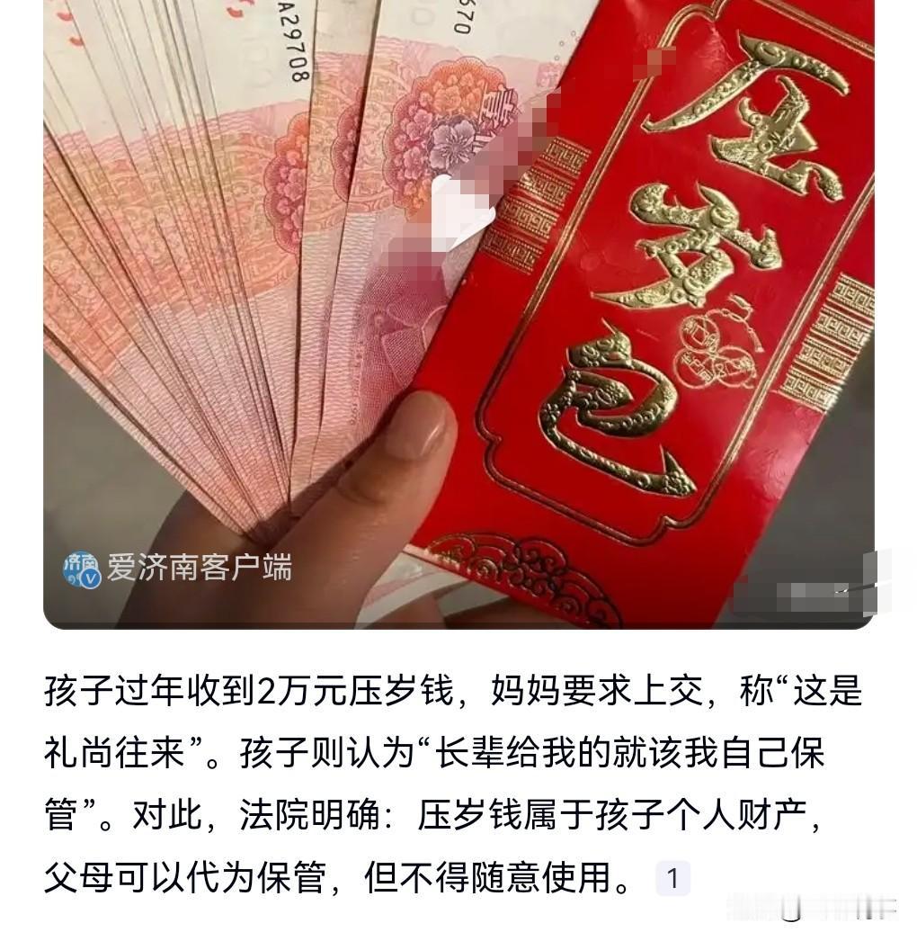 真的是相当的厉害呀。 这些亲戚真有钱,2月19日热搜,妈妈让上交2万压岁钱,孩子当场不干了。 想不到收个压岁钱都能收2万。 这在我们那个年代,那真是无法想象的一件事情。 但是法律上规定,给孩子的压岁钱是属于孩子的,家长最多只能保管。 不过压岁钱都是亲戚看家长的面子给的。妈妈让上交2万压岁钱 孩子当场不干了