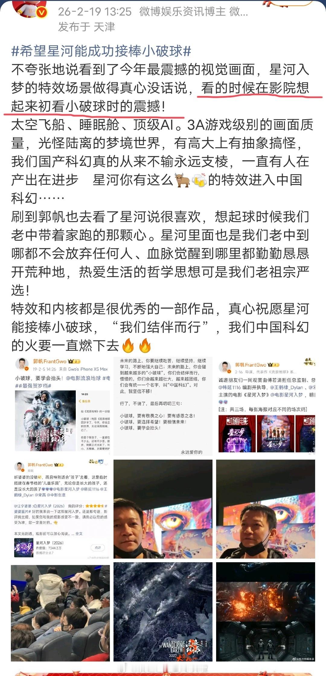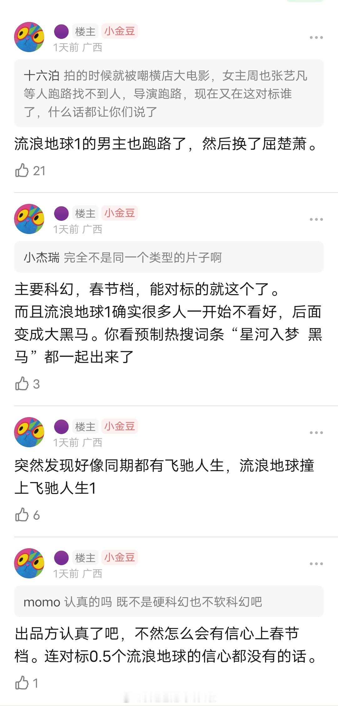 网友说感觉《星河入梦》是想对标流浪地球的,今年没有口碑特别好的,就想来春节档搏一搏。当初很多人对中国科幻不看好,赵今麦屈楚萧没什么名气,对比王鹤棣宋茜的流量来说差远了。郭帆只是一个拍烂片的小导演,对比韩延来说也差远了。星河入梦 流浪地球 票房