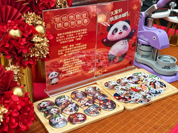 成都天府国际机场推出“智绘休息室镌章贺新春”活动,邀请高端旅客体验DIY天府专属吧唧,赠送手账本印专属印章,并组织新年年画拓印、年夜饭品尝等活动。