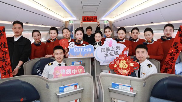 从上海浦东飞往新加坡的国航CA825航班以福字、中国结、缤纷新春挂饰增添年味,并推出妙趣横生的团扇拓印活动,旅客亲手拓下美好新春祝愿。