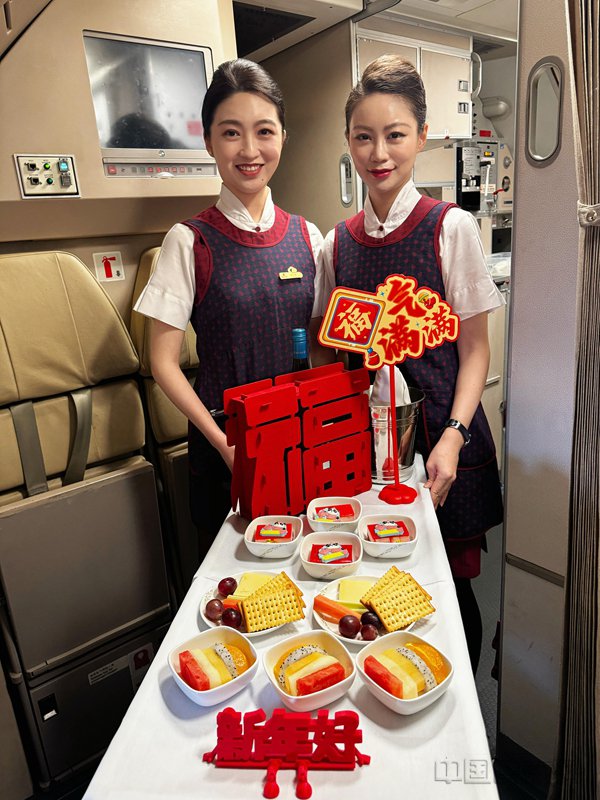 从北京飞往新加坡的国航CA969春节主题航班,精心装点的客舱与特色新春美食,让旅客在万米高空尽享浓郁年味。