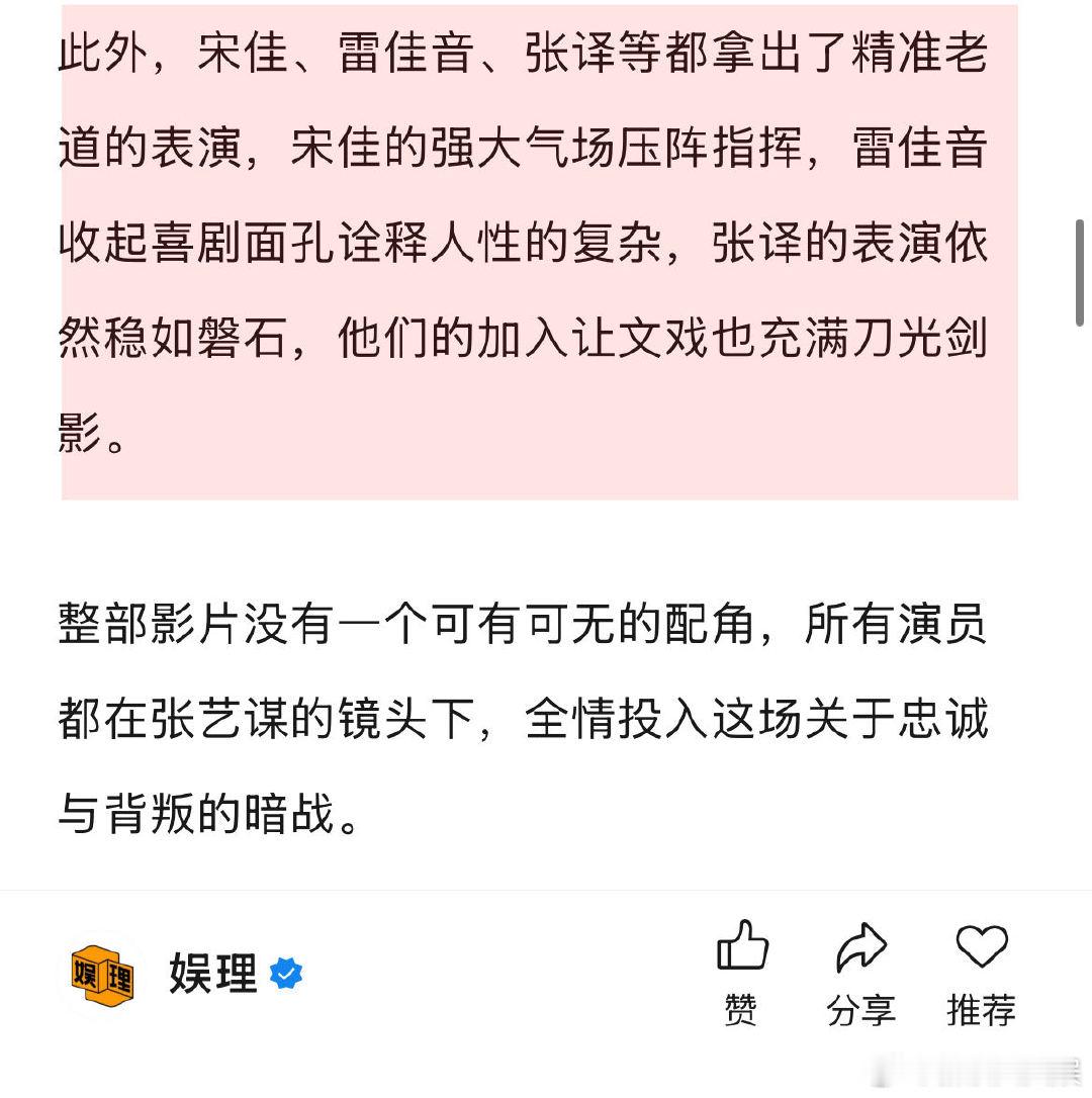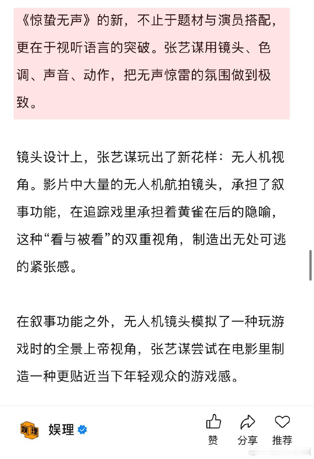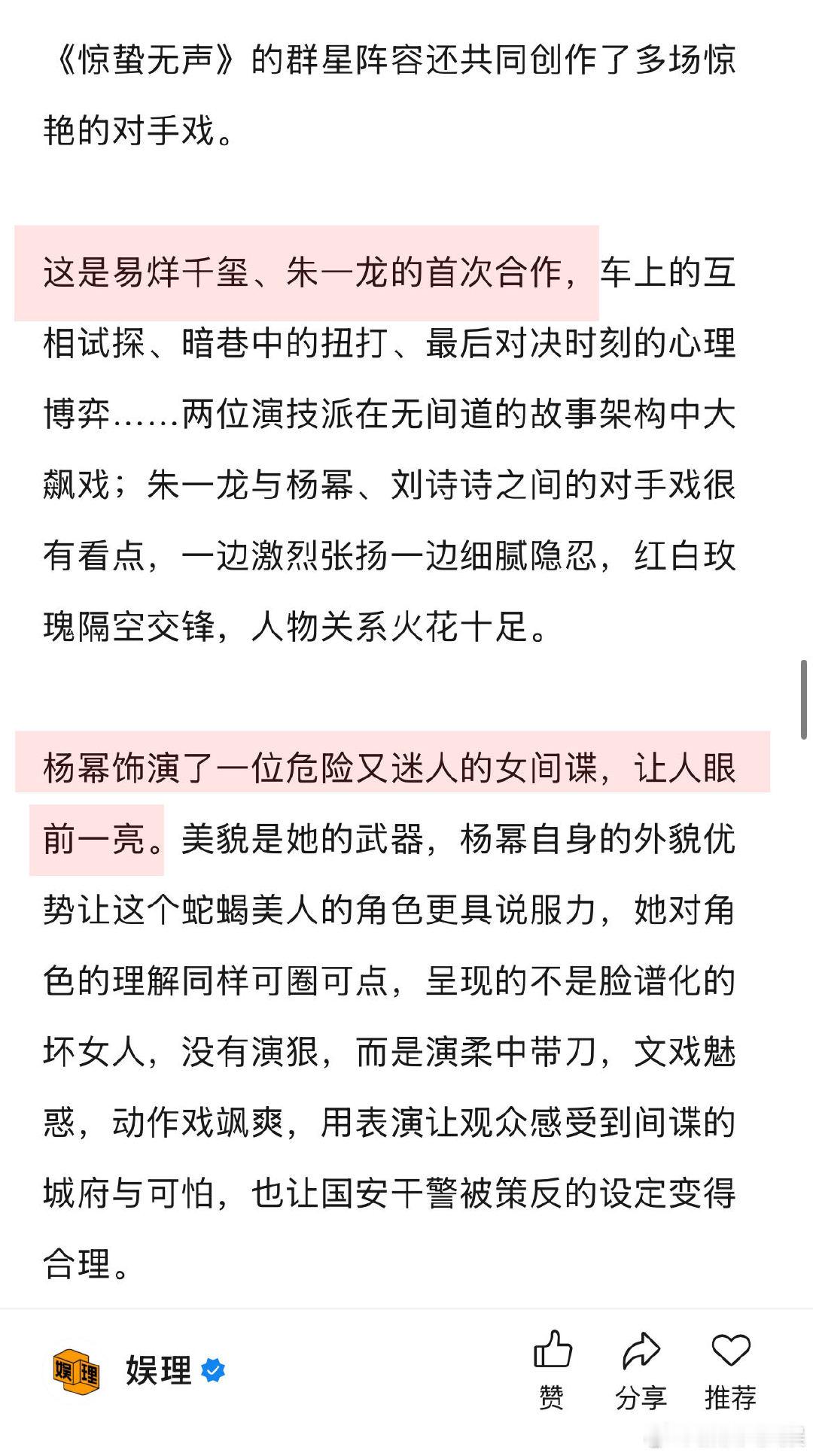 易烊千玺朱一龙撑起了惊蛰无声 75岁张艺谋正是创新的年纪 杨幂在《惊蛰无声》中的角色,让人眼前一亮。美貌是她的武器,杨幂自身的外貌优势让这个蛇蝎美人的角色更具说服力,她对角色的理解同样可圈可点,呈现的不是脸谱化的坏女人,没有演狠,而是演柔中带刀,文戏魅惑,动作戏飒爽,用表演让观众感受到间谍的城府与可怕…娱理独家↓