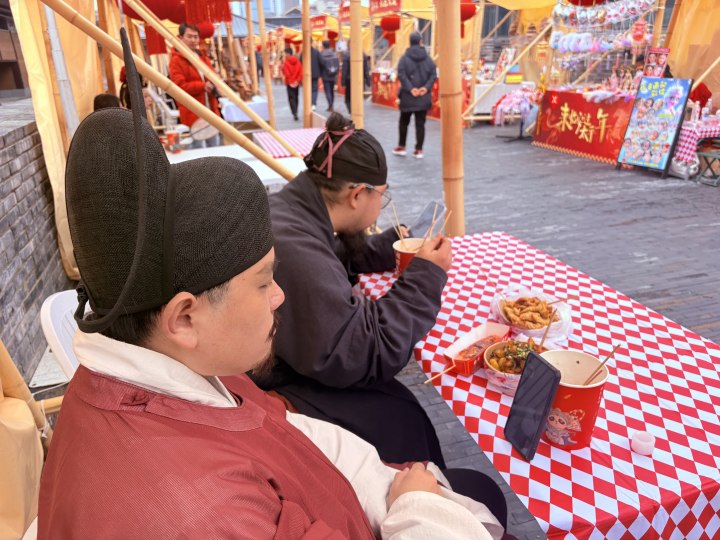 但不管文昌帝君还是吴越钱王,是NPC就得吃饭。中午时分,这对“四百斤”重量级组合在城墙上的ZUI喜越“来临安过太平年”吴越市集摊位上买了烤土豆、小酥肉、关东煮和鸡蛋香肠等小吃当午饭,权当是犒劳下春节加班辛苦了。