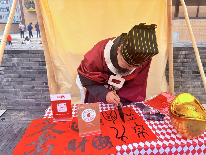 这名文昌帝君同样是一名不到30岁的小伙,叫孙晗,河南人,大学时期就成立过汉服社,写得一手好毛笔字,他也因为没买到票而来客串一天NPC,和家人打电话拜年。