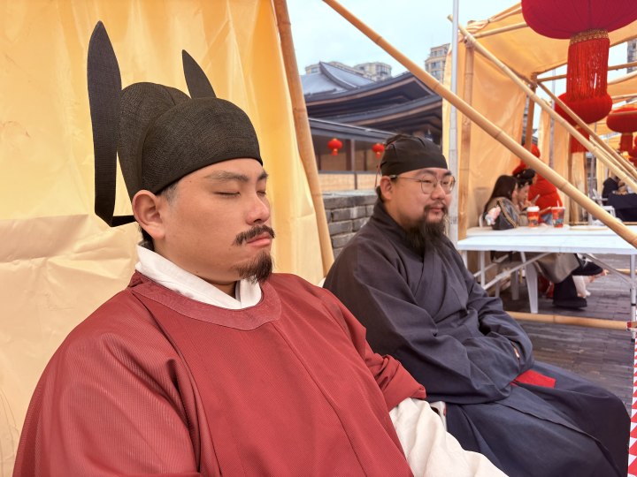 郭涛是来杭三年的新杭州人,他的主业是服装师,但这个春节从年初二到年初七,他都是临安衣锦城城墙上的NPC,主要cos“临安第一历史名人”——吴越王钱镠。