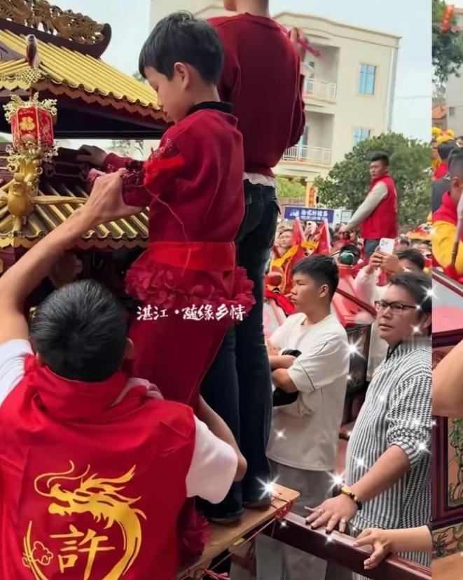 第一次见到这么小的妈祖阿童,真的跟别的仪式不太一样。小孩刚被抱下轿的时候,整个人还懵懵的,好像不太明白大家在忙什么。 站在轿上显得十分茫然。更具戏剧性的是,据现场视频和目击者称,自他上场后,原本数人就能抬起的妈祖神轿竟“重如千斤”,任凭众人发力也纹丝不动,导致游神仪式当场停滞。 其实妈祖选阿童是很有讲究的,不是随便选随便换的,仪式里的每一步都是经过反复斟酌的,大家心里都该有敬畏之心。这样的做法,真的合适吗?