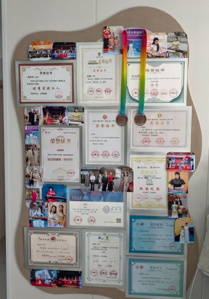 她在小学前的暑假报名了课外培训班,开始接触古筝,学起来很快,暑假结束后就考取了二级。古筝通常分为十级,初级是1-4级,中级是5-7级,高级是8-10级。
