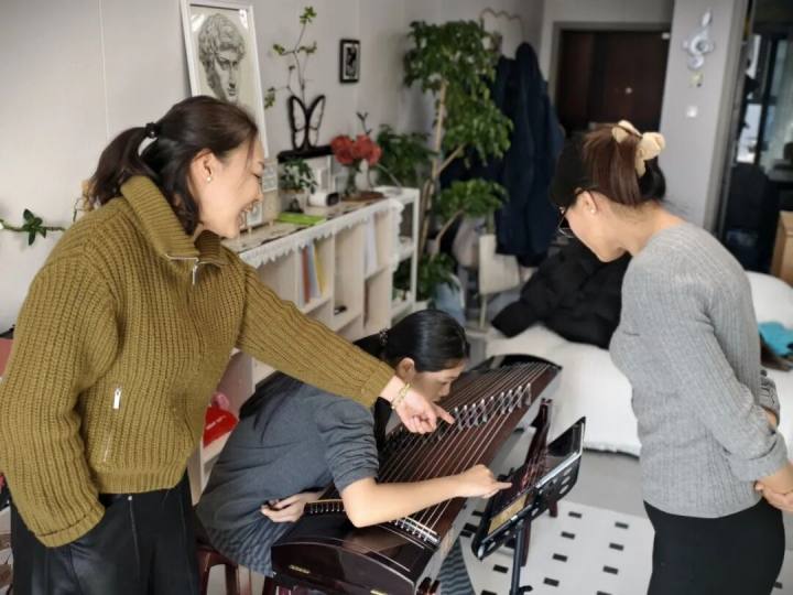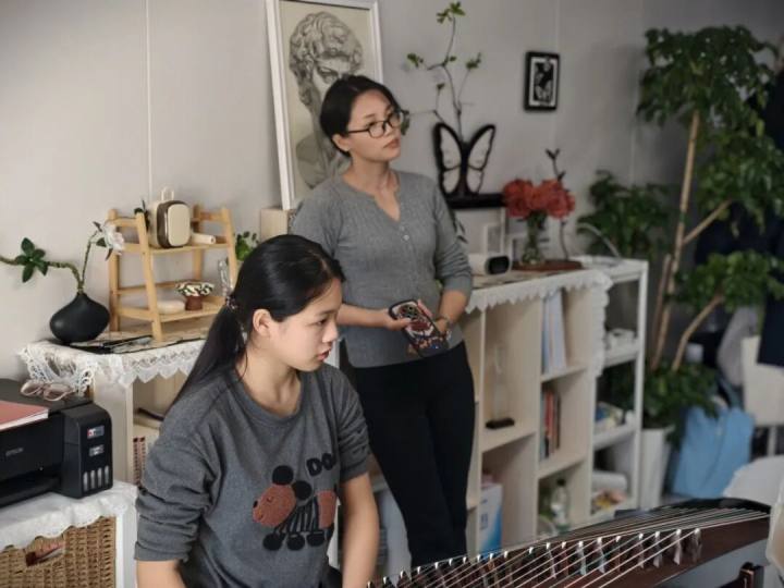 婉婷在客厅弹古筝,其余小伙伴也在房间练习,有的吹笛子,有的在拉小提琴。一时间,数种乐器的声音同时响起,和几位妈妈的谈话声交织在一起。