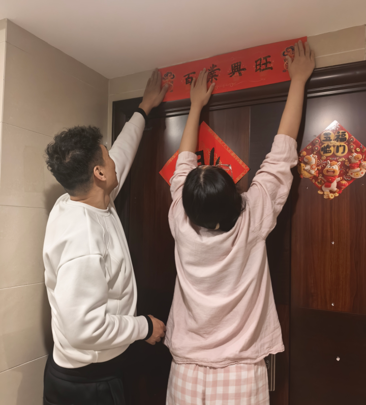 初二家长方妈,前两天发了条朋友圈,记录着女儿婉婷和爸爸一起写春联、贴春联,还购买了许多富有年味的小装饰,这是他们第一次在杭州过年。