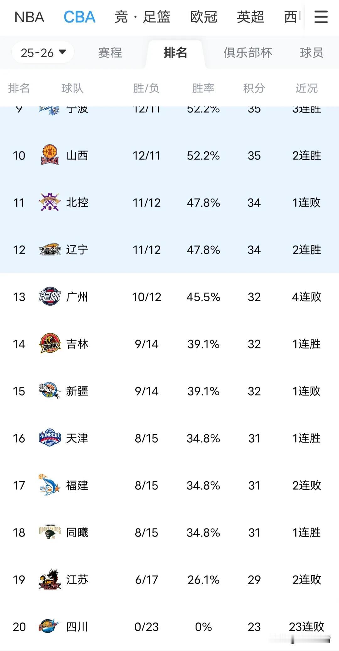 CBA2025-2026赛季常规赛赛程已经过半,目前球队排名如下。 第一名:广厦,19胜4负,积42分。 第二名:上海,19胜4负,积42分。 第三名:广东,17胜6负,积40分。 第四名:青岛,14胜9负,积37分。 第五名:深圳,14胜9负,积37分。 深圳这赛季好猛,竟然排名第五了,拥有豪华阵容的北京仅仅第七,而辽宁则落幕的好快,排名辽宁第十二,而风雨交加的四川则一胜难求,已经23连败排名垫底。CBA赛程析 CBA排名预测 CBA赛程 cba赛季 cba排名