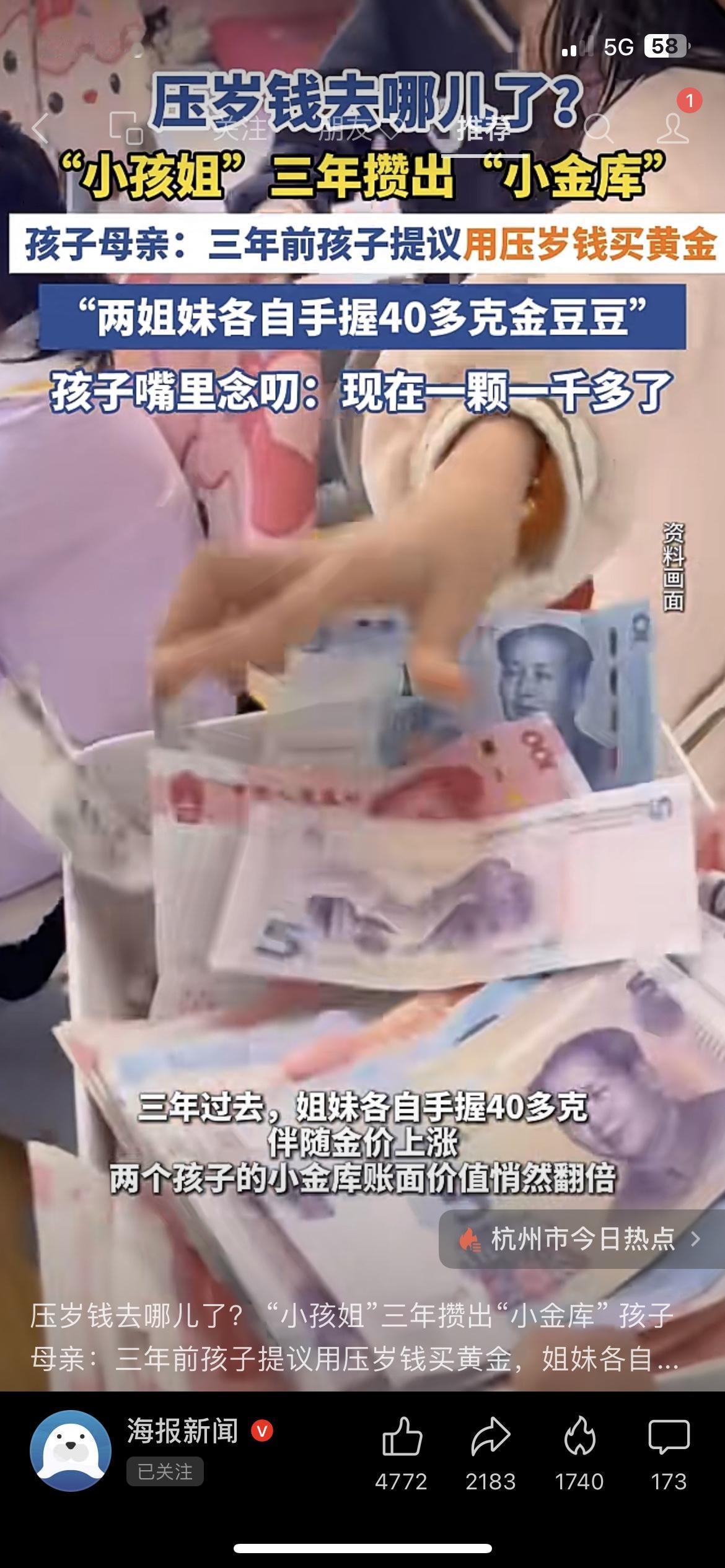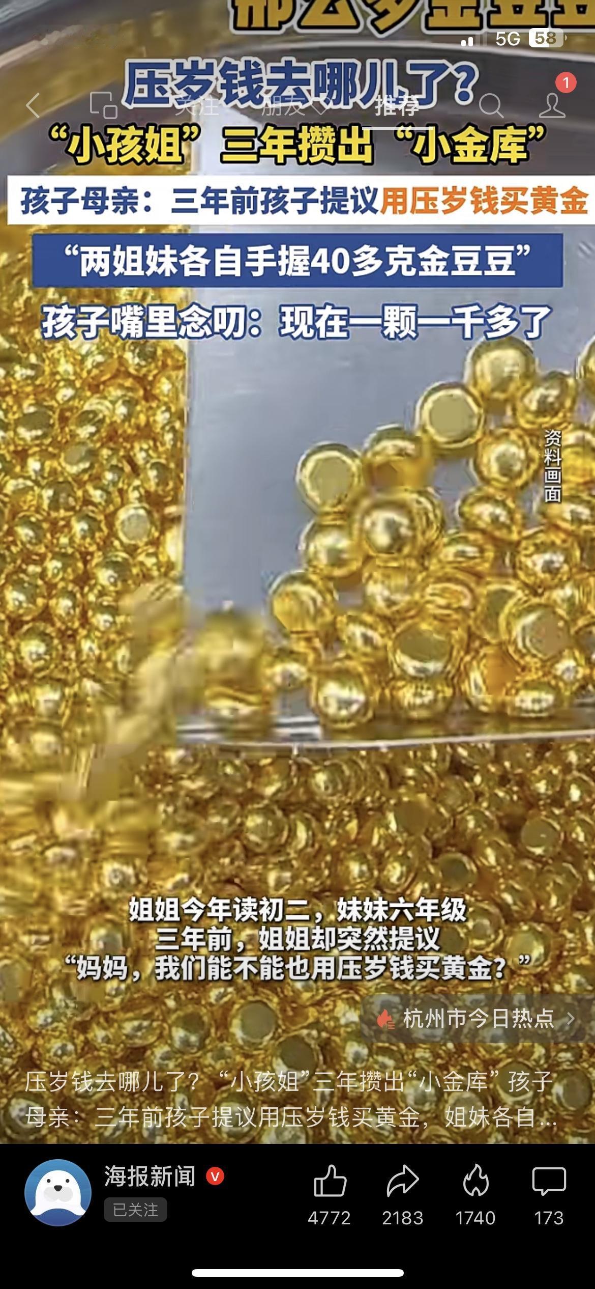 扎心了!现在的小孩理财,比咱大人还厉害! 杭州两位“小孩姐”,用压岁钱买金豆豆,3年直接翻倍,每人手握40多克。 孩子都懂:金子保值、钱放着会缩水。 反观我们小时候,压岁钱要么上交,要么全花光。 这不是炫富,是最朴素的普通人理财智慧。 市场有风险,投资需谨慎 你小时候的压岁钱,是存着还是花光了? 压岁钱理财 金豆豆 普通人理财
