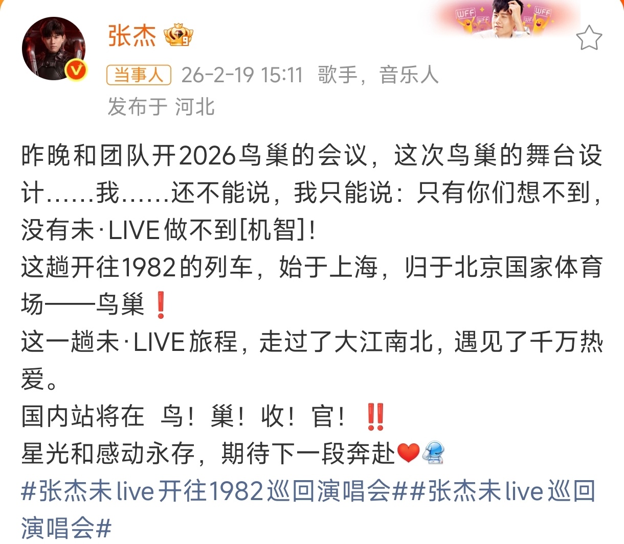 张杰演唱会国内站将在鸟巢收官张杰演唱会国内站在鸟巢收官,连开12场,始于上海,北京结束,看之前杰哥演唱会的排面和舞美,已经开始期待鸟巢的排面了! 张杰未live巡回演唱会